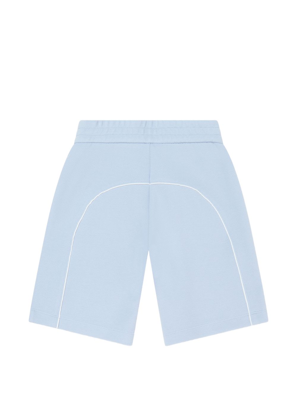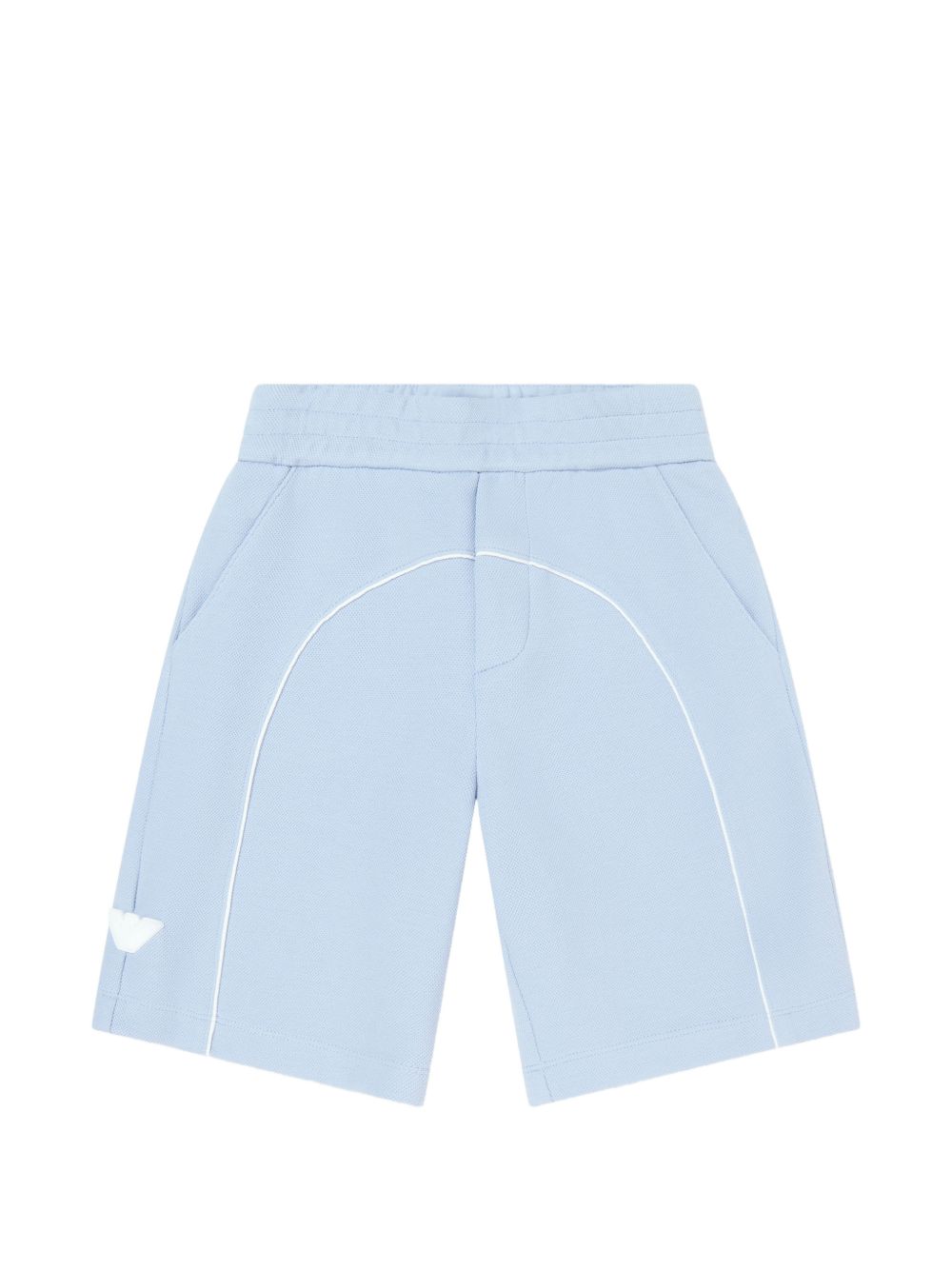 Bermuda con bordino celeste, elastico in vita, tasche laterali, logo applicato