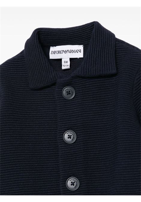 blu di prussia maglia a coste finitura testurizzata logo ricamato chiusura frontale con bottoni colletto classico maniche lunghe due tasche a filetto davanti fondo dritto sfoderato