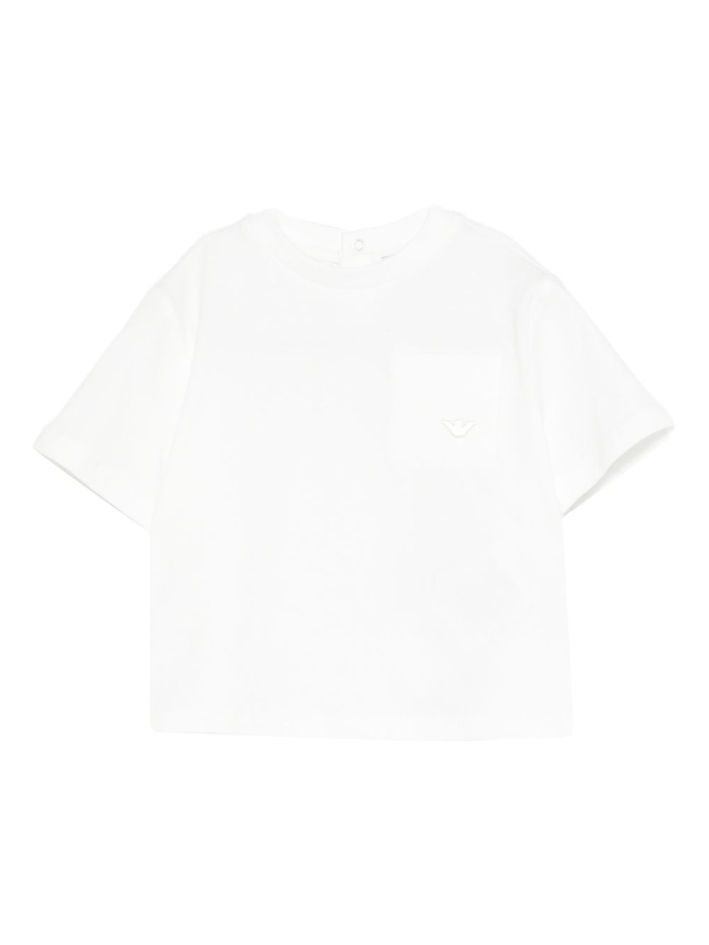 T-shirt con taschino sul petto, bianco, girocollo, maniche corte, chiusura posteriore con bottone