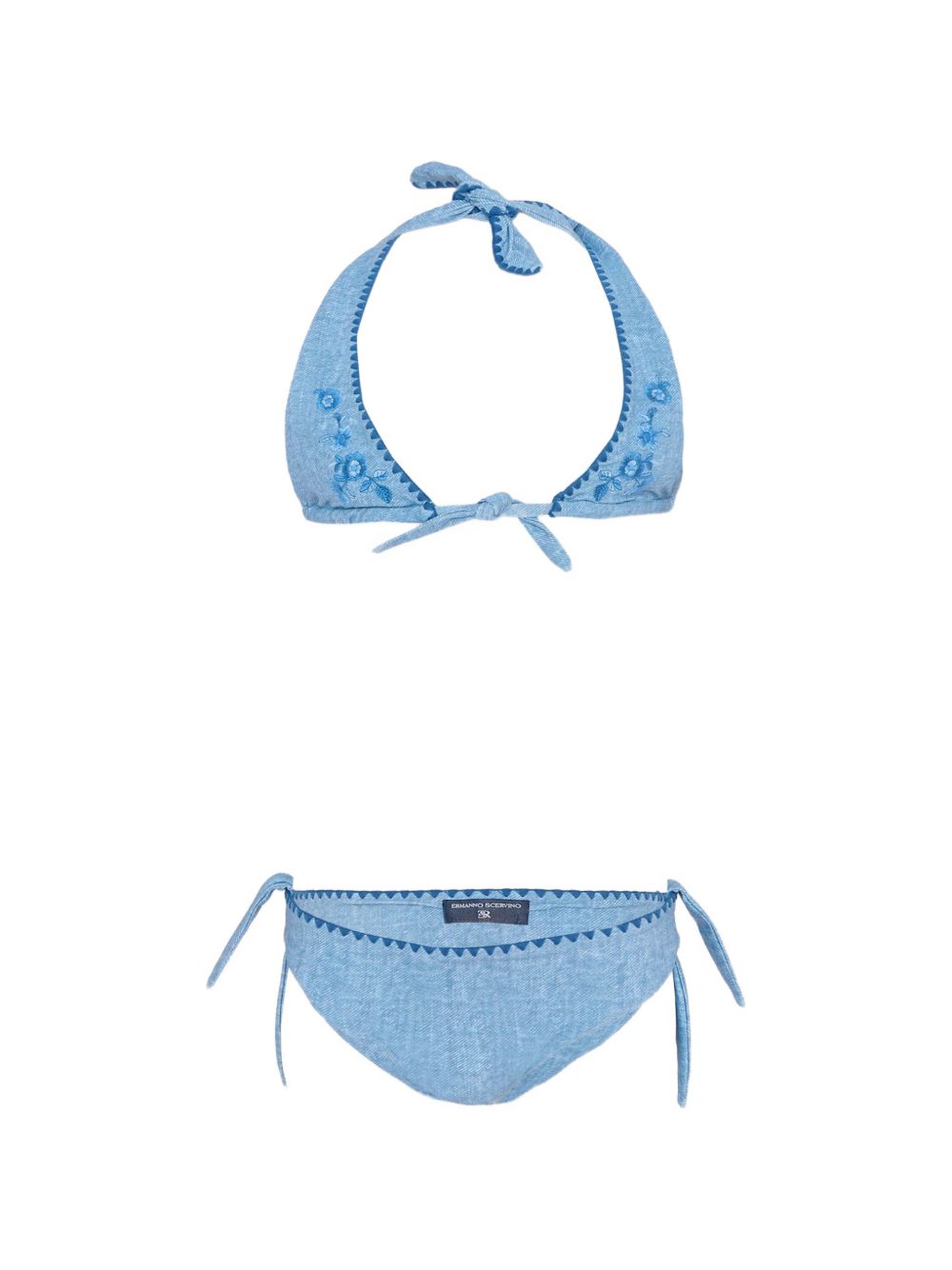 Bikini azzurro cielo a triangolo con ricamo, chiusura con nodo. I costumi da bagno devono essere provati indossando il proprio indumento intimo