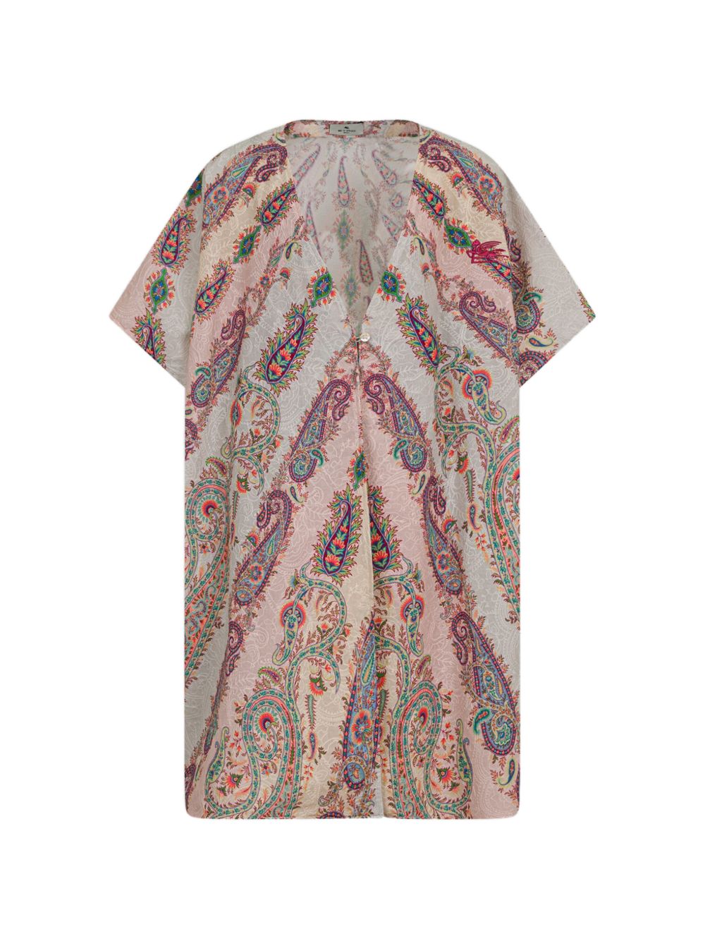 Abito con ricamo paisley beige e multicolore stampa all-over maniche corte scollo a V cotone