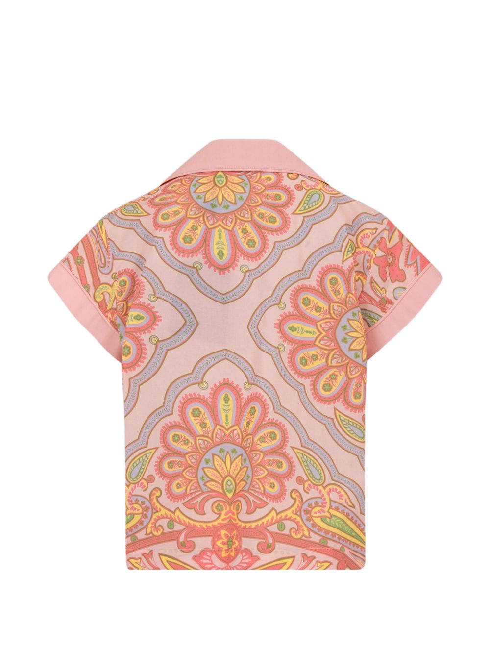 Camicia con stampa floreale, rosamulticolor, chiusura con bottoni, maniche corte, tasca sul petto, colletto stile campeggio.