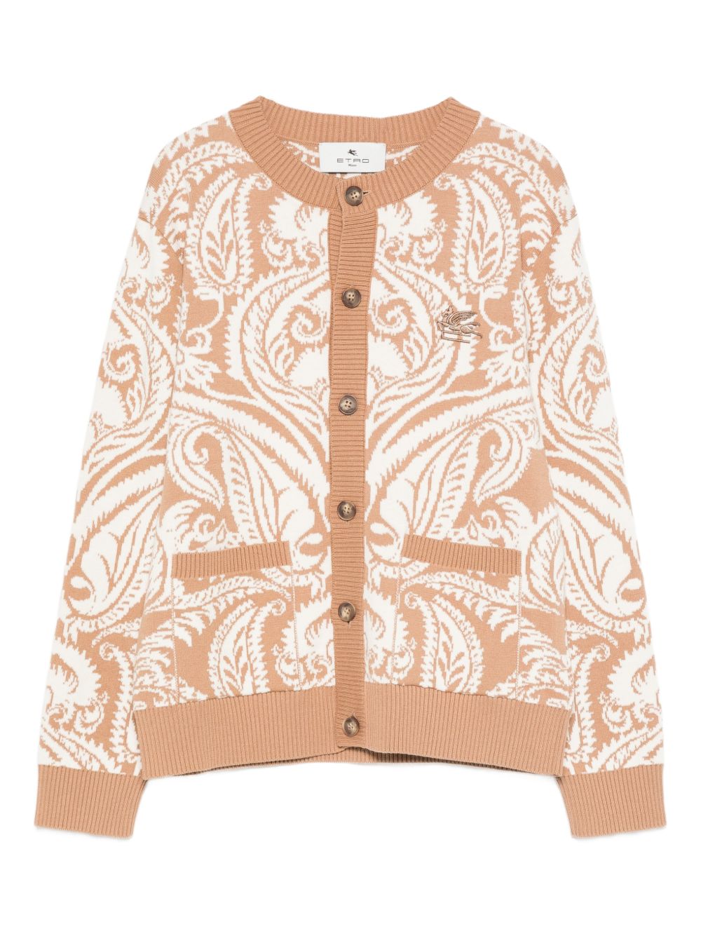 Cardigan avorio/beige, motivo Paisley, chiusura a bottoni, girocollo, due tasche frontali, orlo a coste.