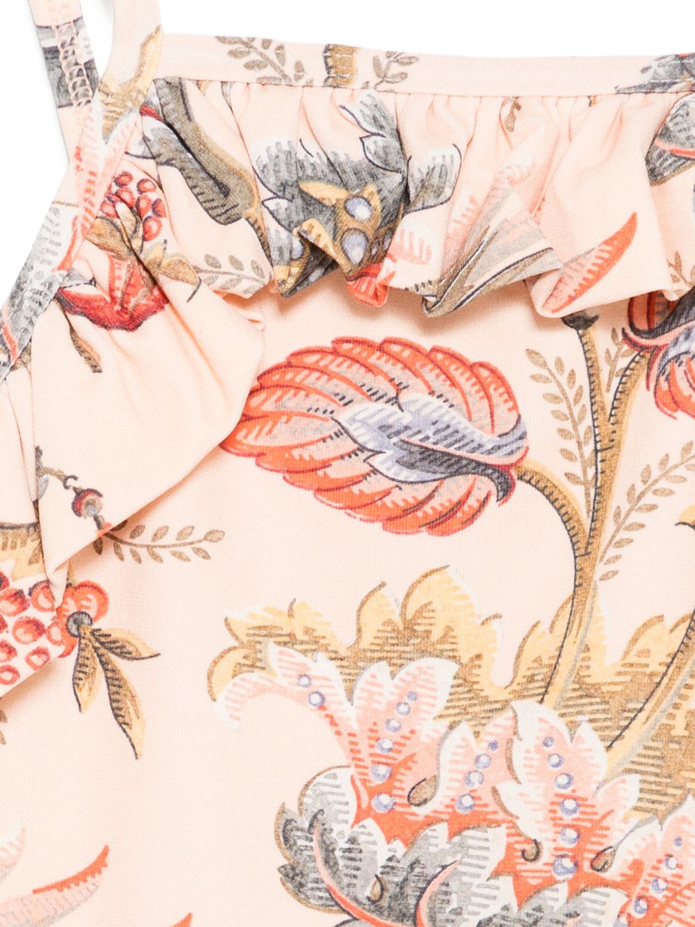 Costume con stampa floreale color pesca e arancione, volant, spalline sottili.