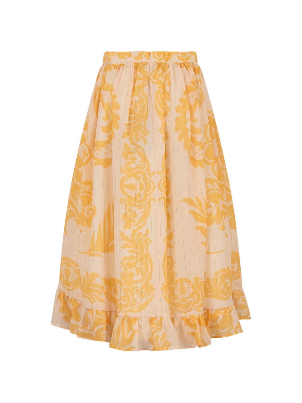 Gonna beige, giallo, stampa a fiori, con ruches, vita elasticizzata, motivo a righe.