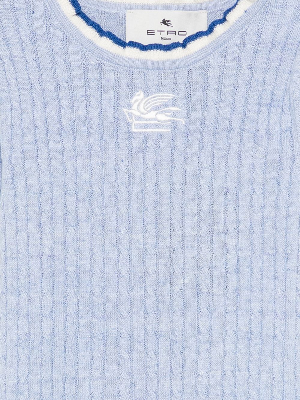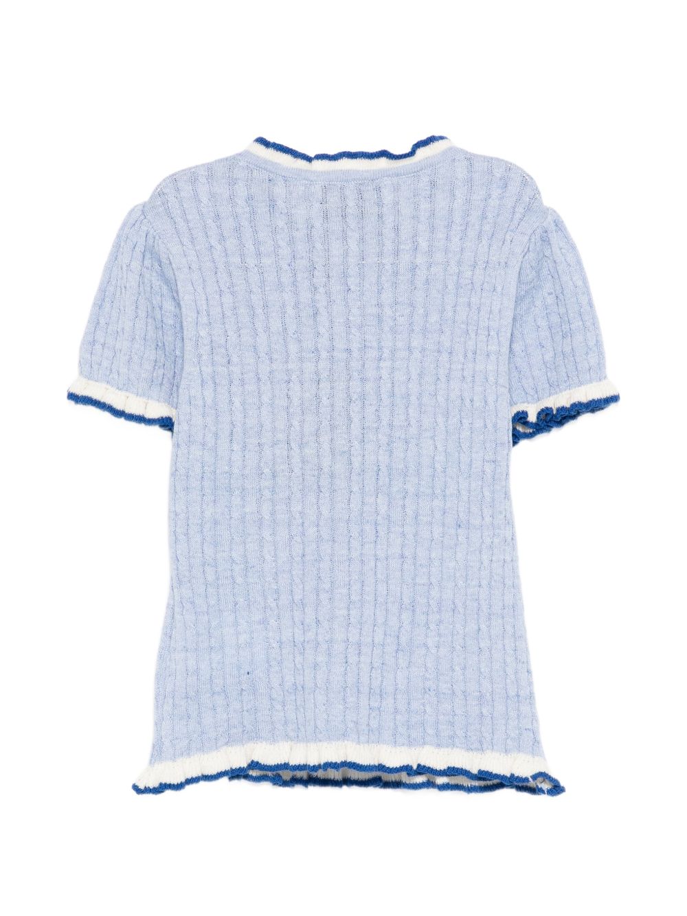 T-shirt azzurro, lavorazione a maglia,design a coste, rifiniture con ruches, girocollo, maniche corte.