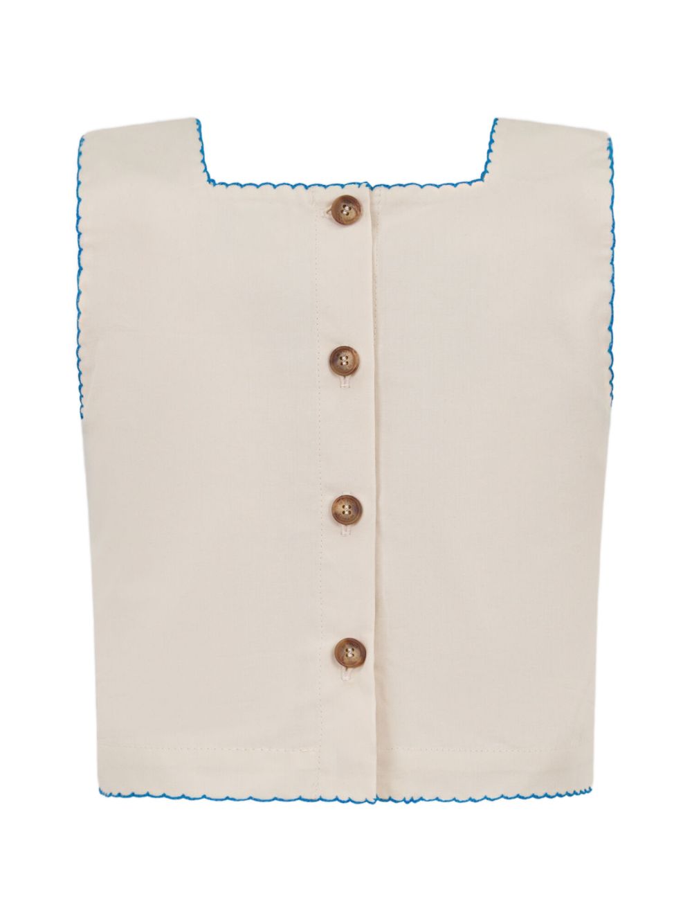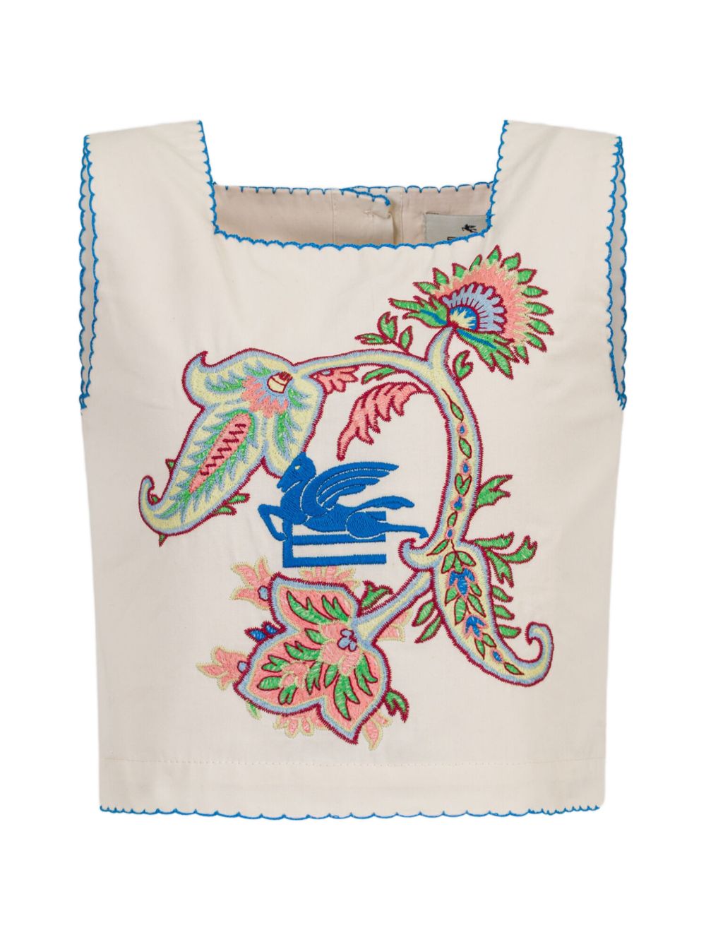 Top con ricamo paisley floreale color crema, scollo quadrato, chiusura con bottoni, bordo smerlato, senza maniche.