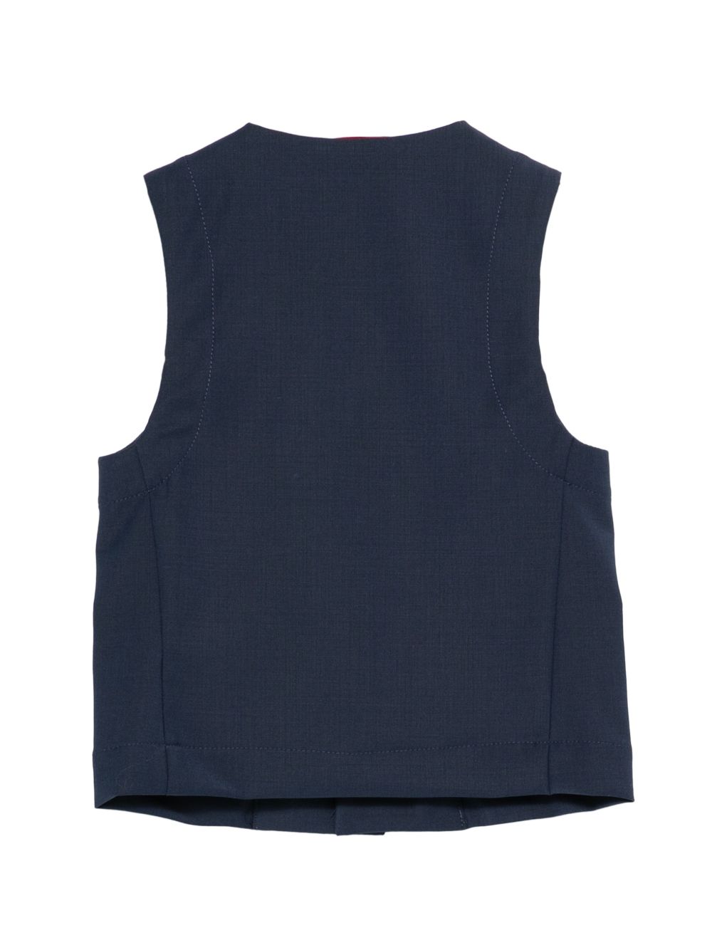 Gilet blu scuro, scollo a V, chiusura con bottoni, due tasche frontali, senza maniche.