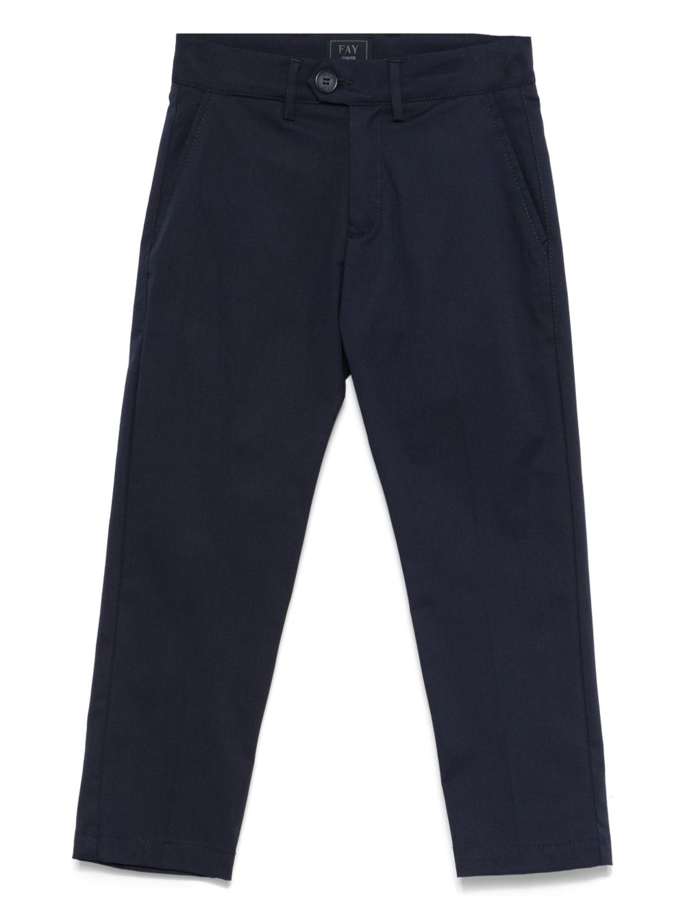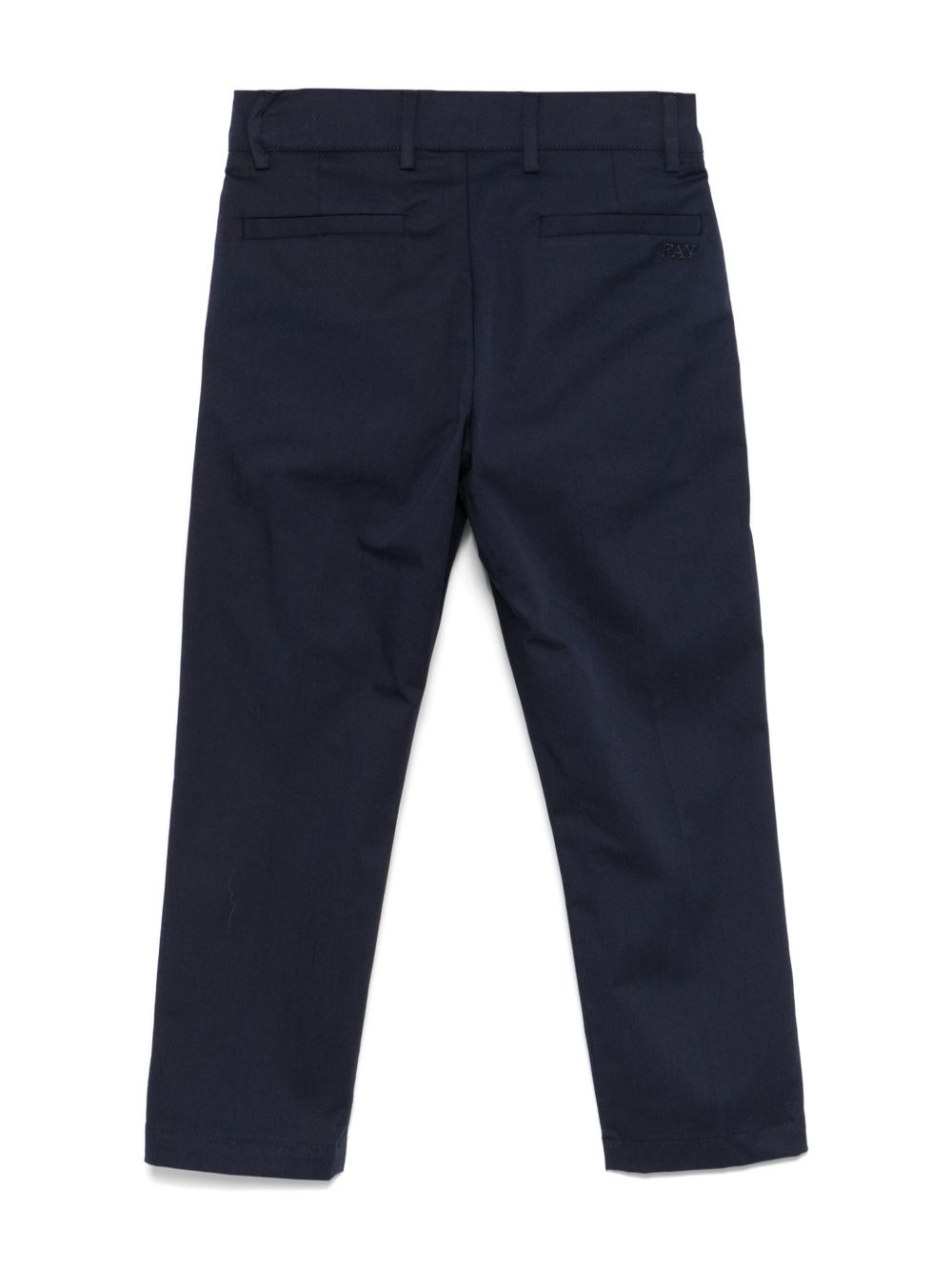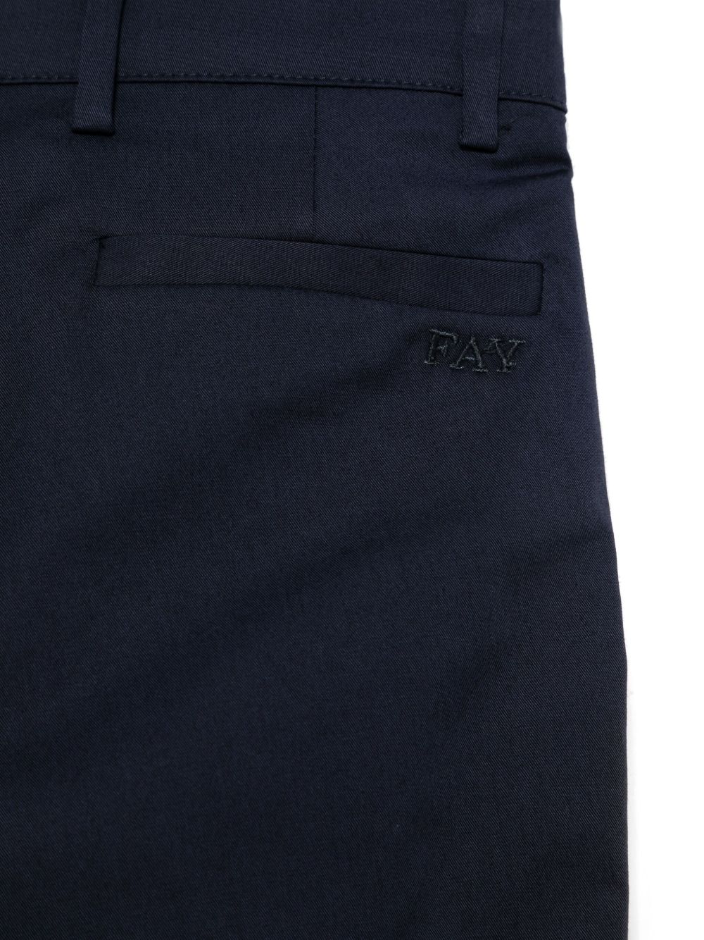 Pantalone blu navy, chiusura con cerniera nascosta e bottone, passanti per cintura, due tasche diagonali laterali, due tasche posteriori a filetto.