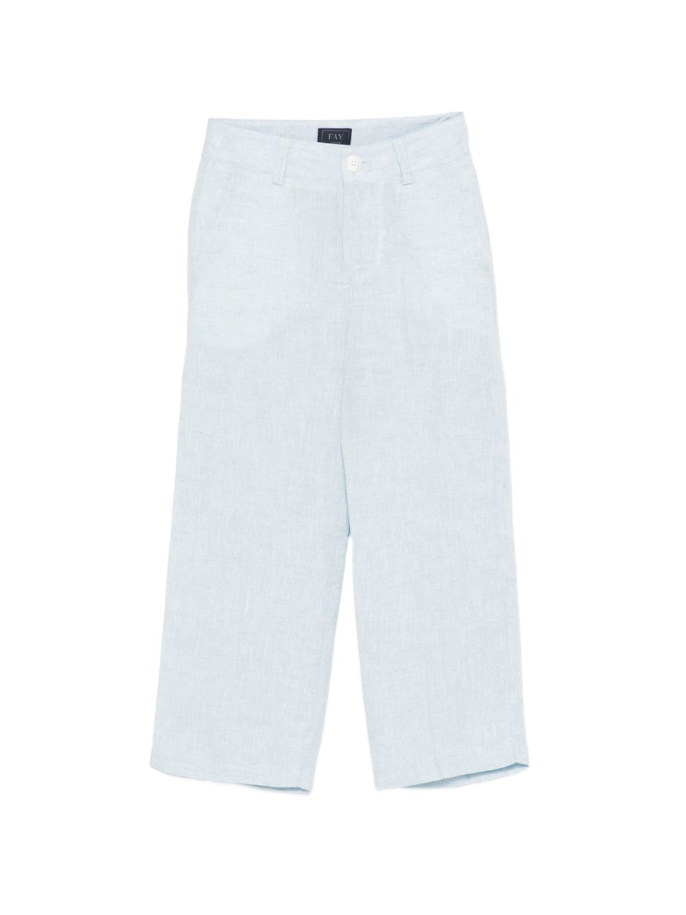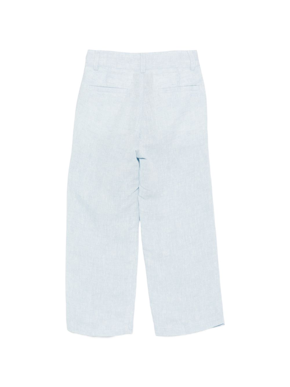 Pantalone azzurro, chiusura con bottoni, passanti per cintura, tasche a filetto sul retro, lino.