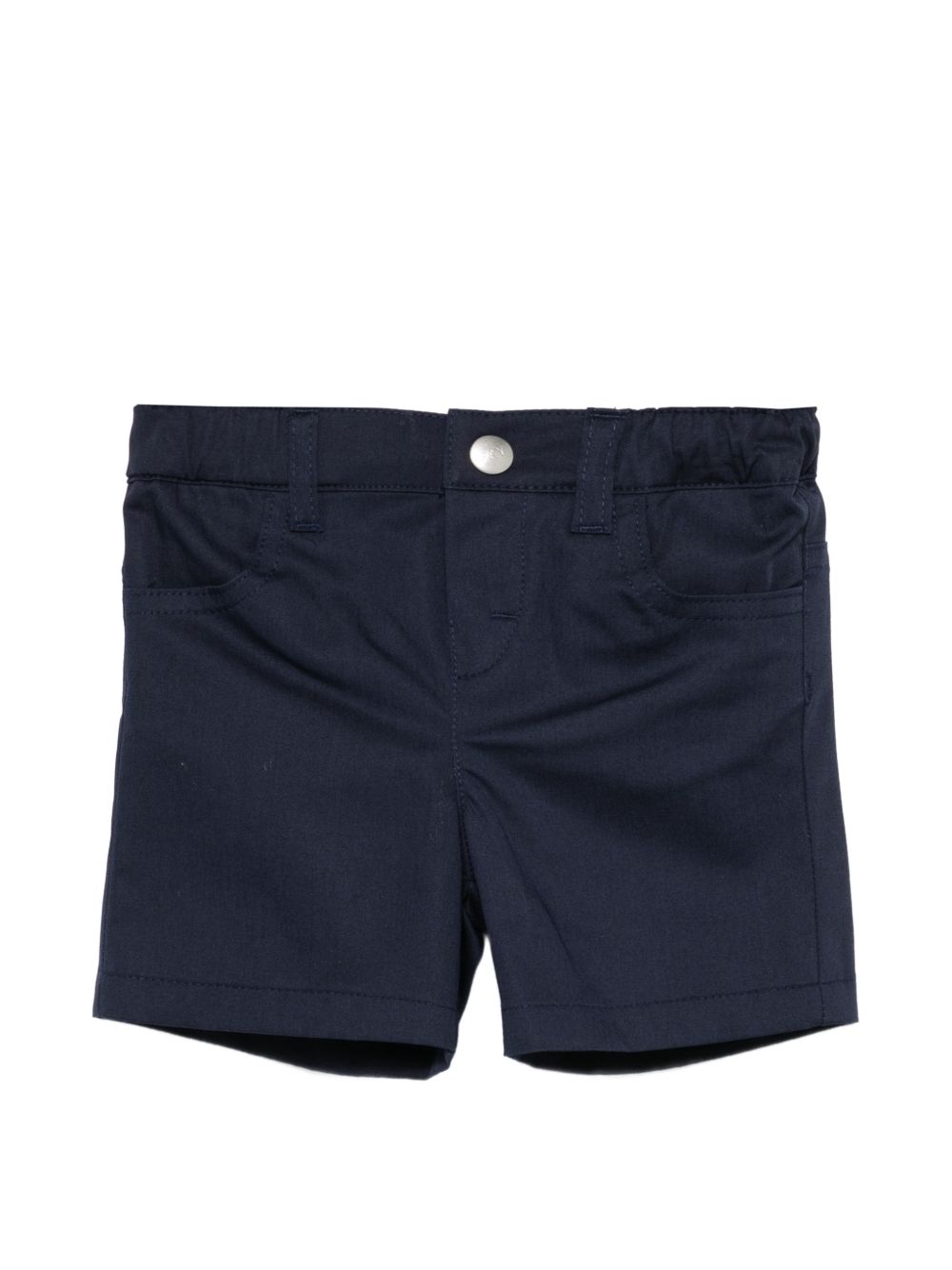 Shorts con cintura elasticizzata blu scuro, cuciture, bottoni, tasche, passanti per cintura