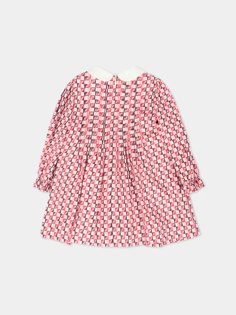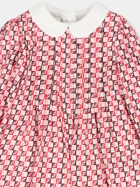 Vestito rosa plissettato del luxury brand Fendi Kids, a maniche lunghe, con colletto peter pan bianco, chiusura con zip sul retro e polsini elasticizzati. È decorata con iconica FF a contrasto all-over. Made in Italy