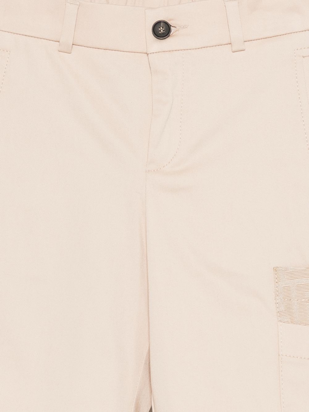 dettaglio toppa beige chiusura con bottoni elastico in vita passanti per cintura tasche laterali