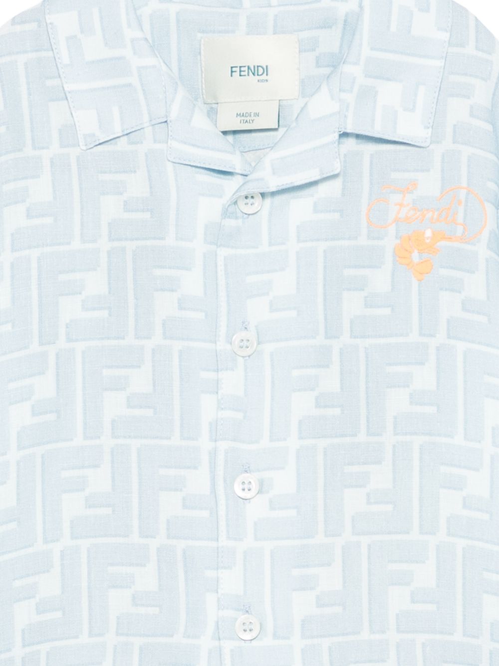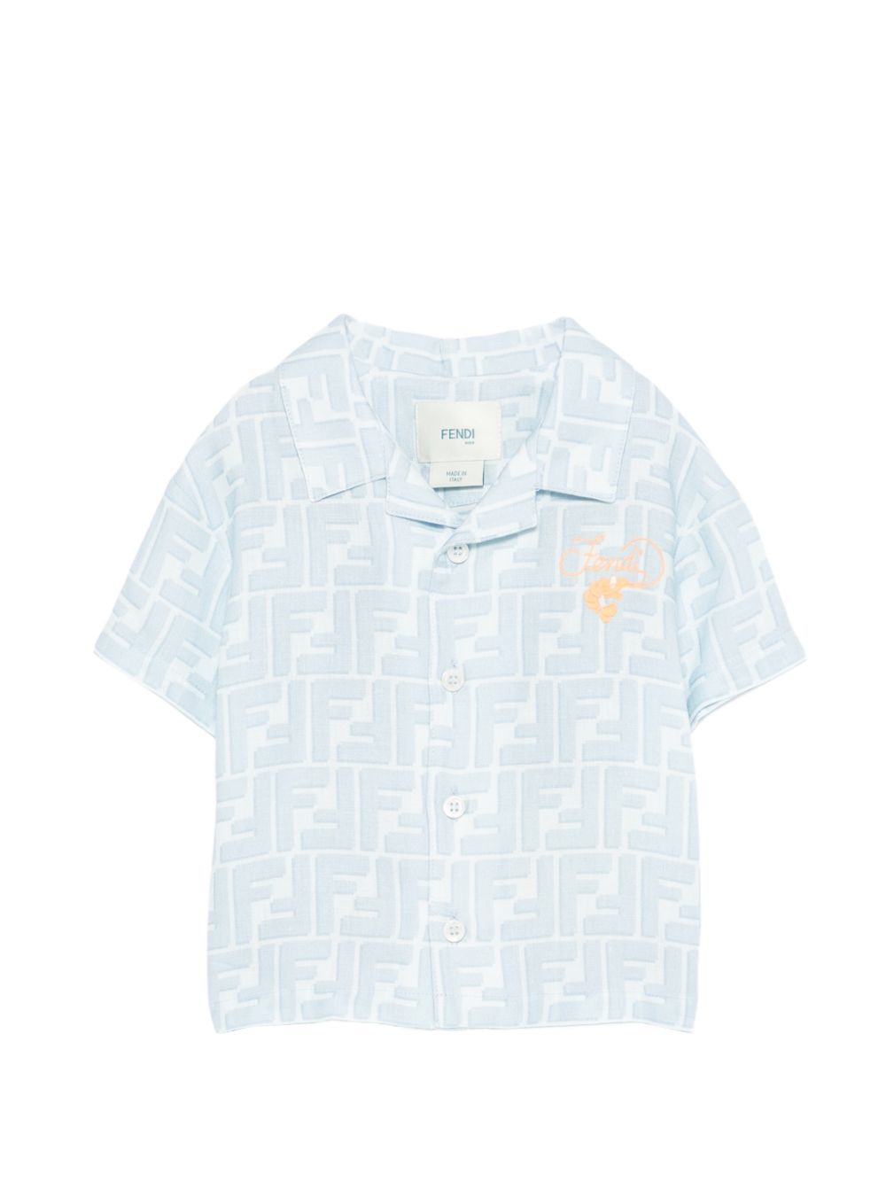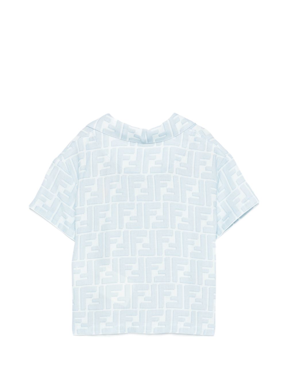 Monogramma FF in jacquard azzurro, logo ricamato sul petto, colletto camp, chiusura frontale con bottoni, maniche corte, orlo dritto.