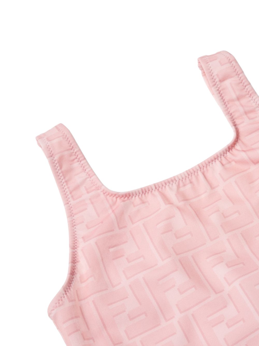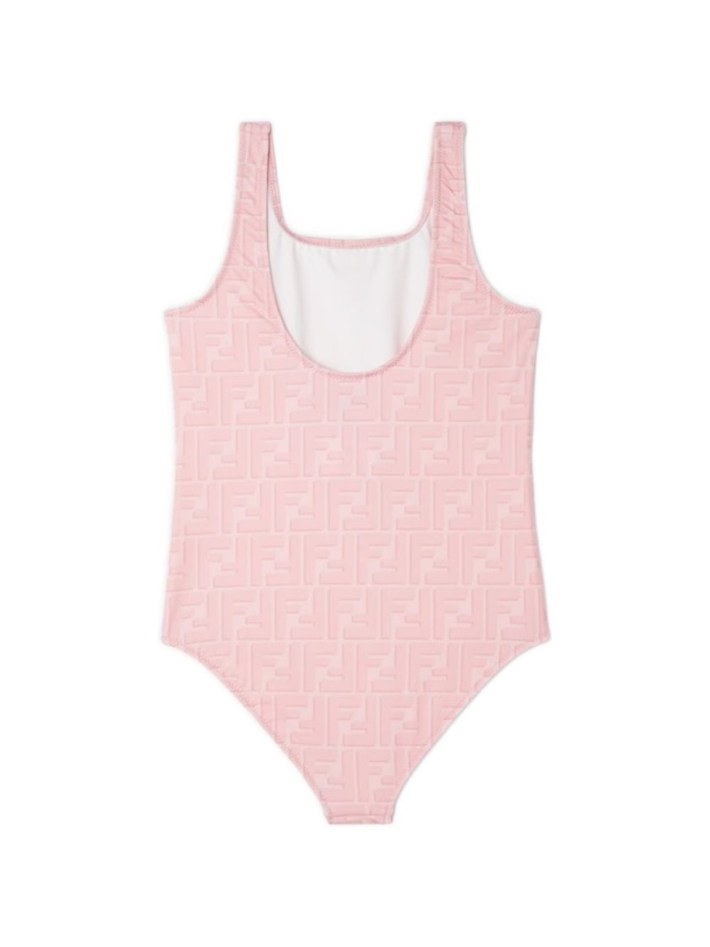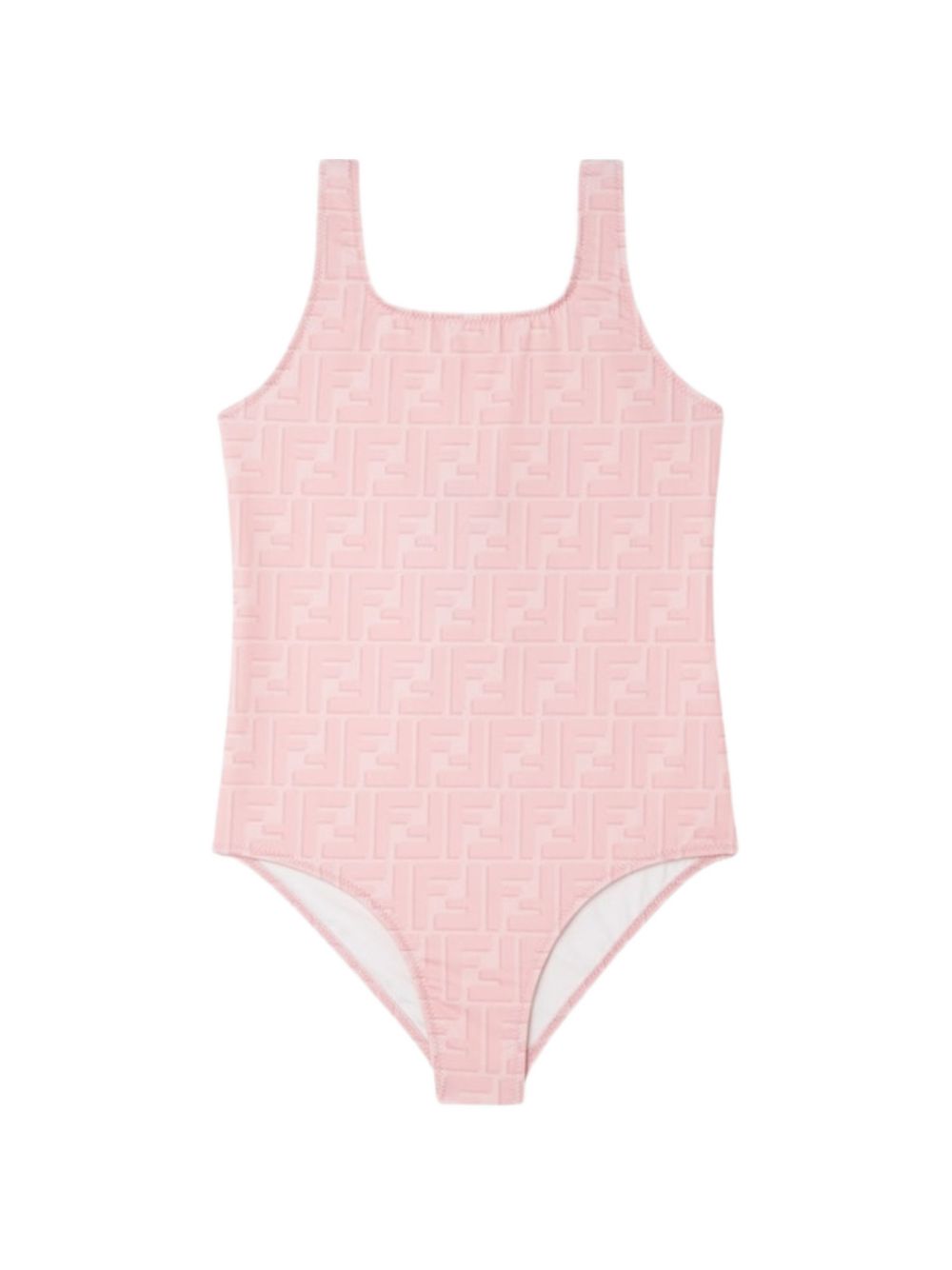 Costume da bagno rosa con logo all-over, scollo quadrato e senza maniche. Ricorda di provare il costume sopra i tuoi indumenti.