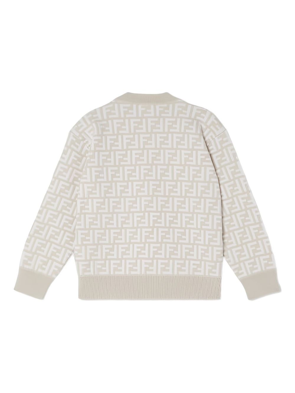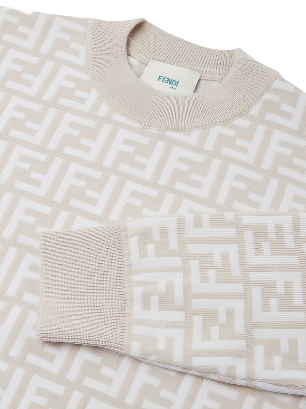 modello con logo in cotone beige, scollo rotondo, maniche lunghe, polsini e orlo a coste