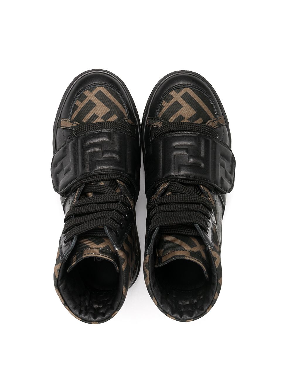 Scarpe bambino Fendi kids in pelle di colore marrone con motivo FF; modello punta, altezza alla caviglia, suola piatta in gomma, chiusura frontale a strappo.