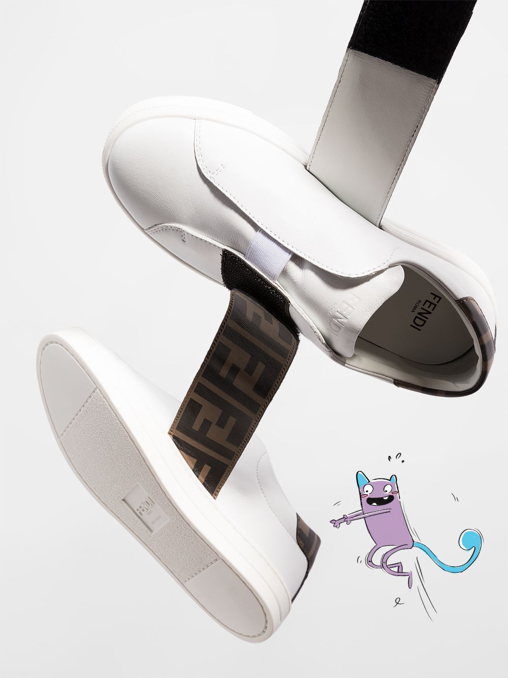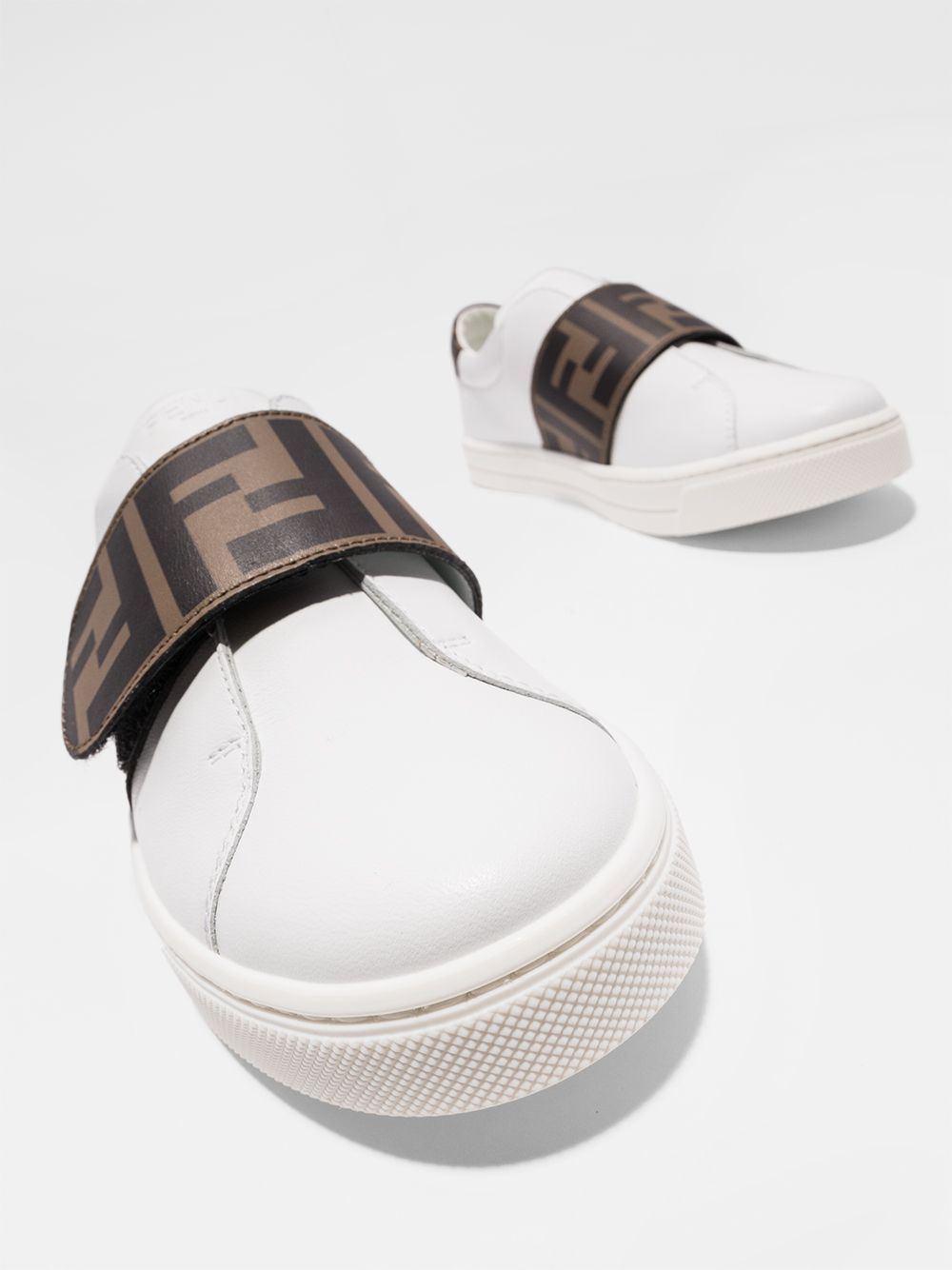 Sneakers unisex bambino Fendi kids in pelle di colore bianco con motivo FF; modello punta tonda, suola piatta in gomma, chiusura con strappo.