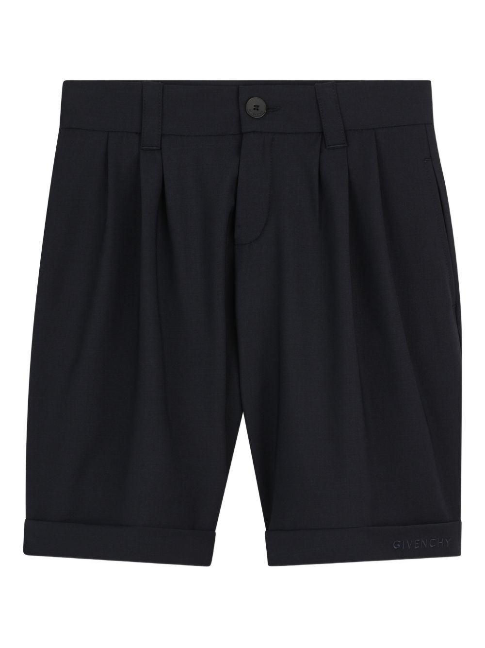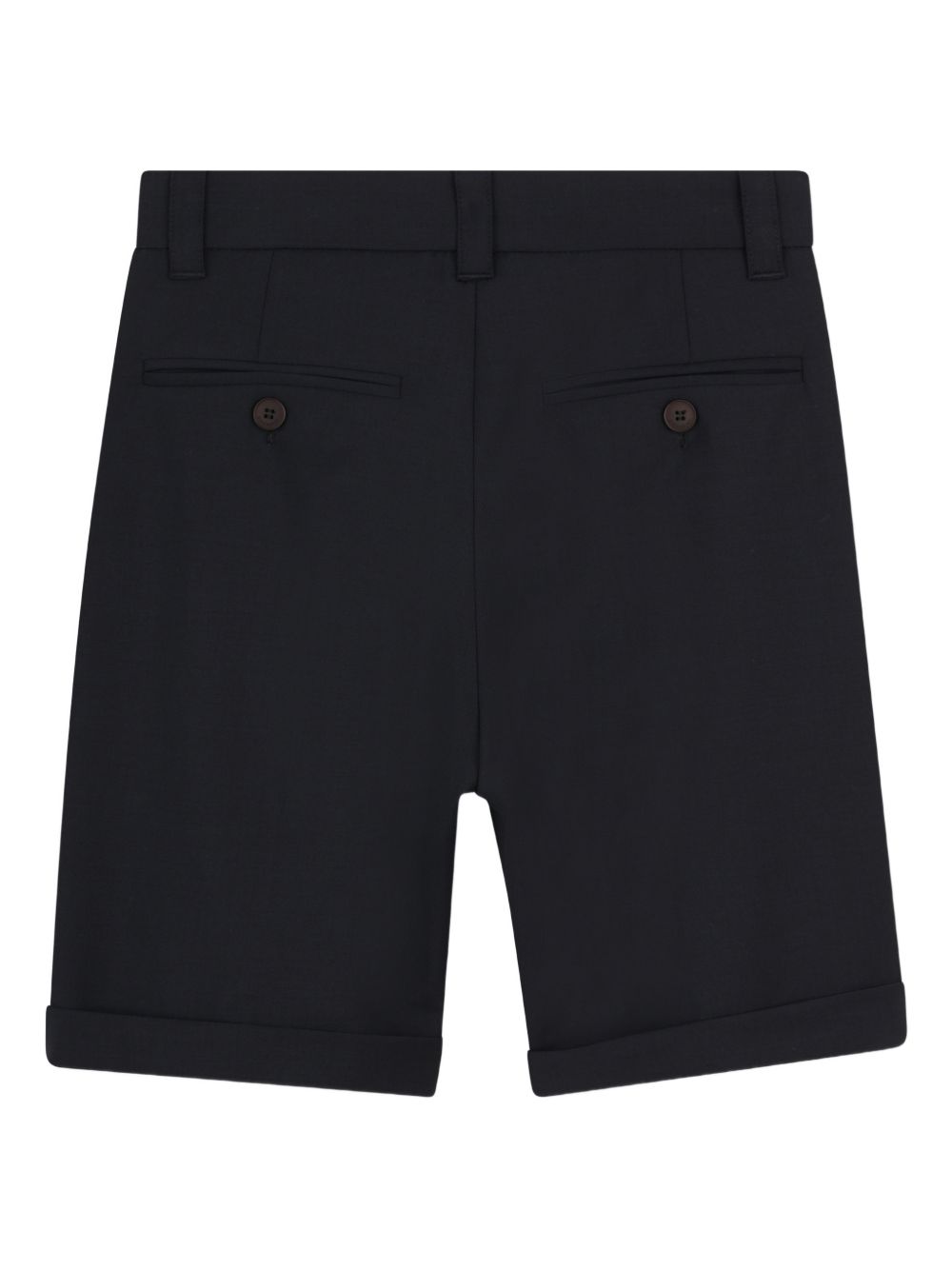 Bermuda con passanti per cintura con chiusura a bottoni blu scuro, orlo risvoltato, tasche anteriori plissettate con chiusura a bottoni sul retro
