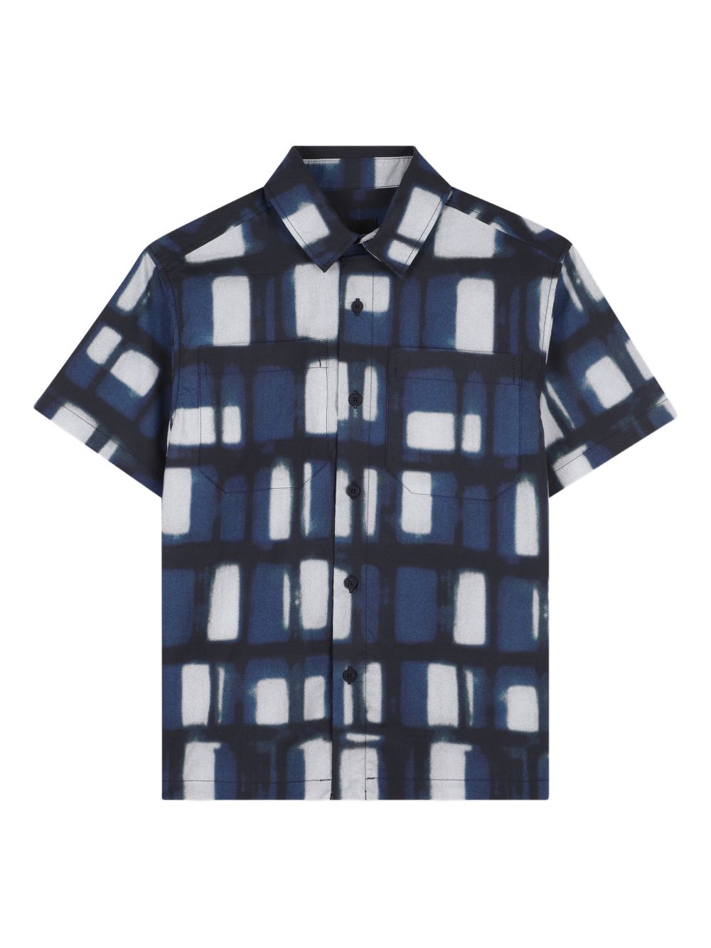 Camicia con maniche corte con fantasia blu, chiusura con bottoni, tasca sul petto, colletto classico