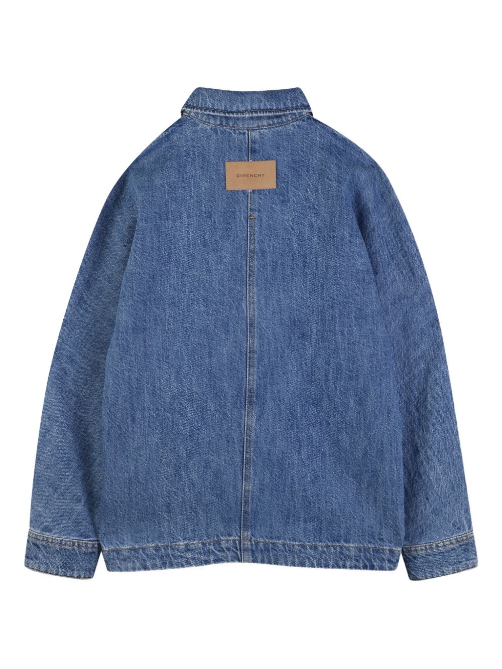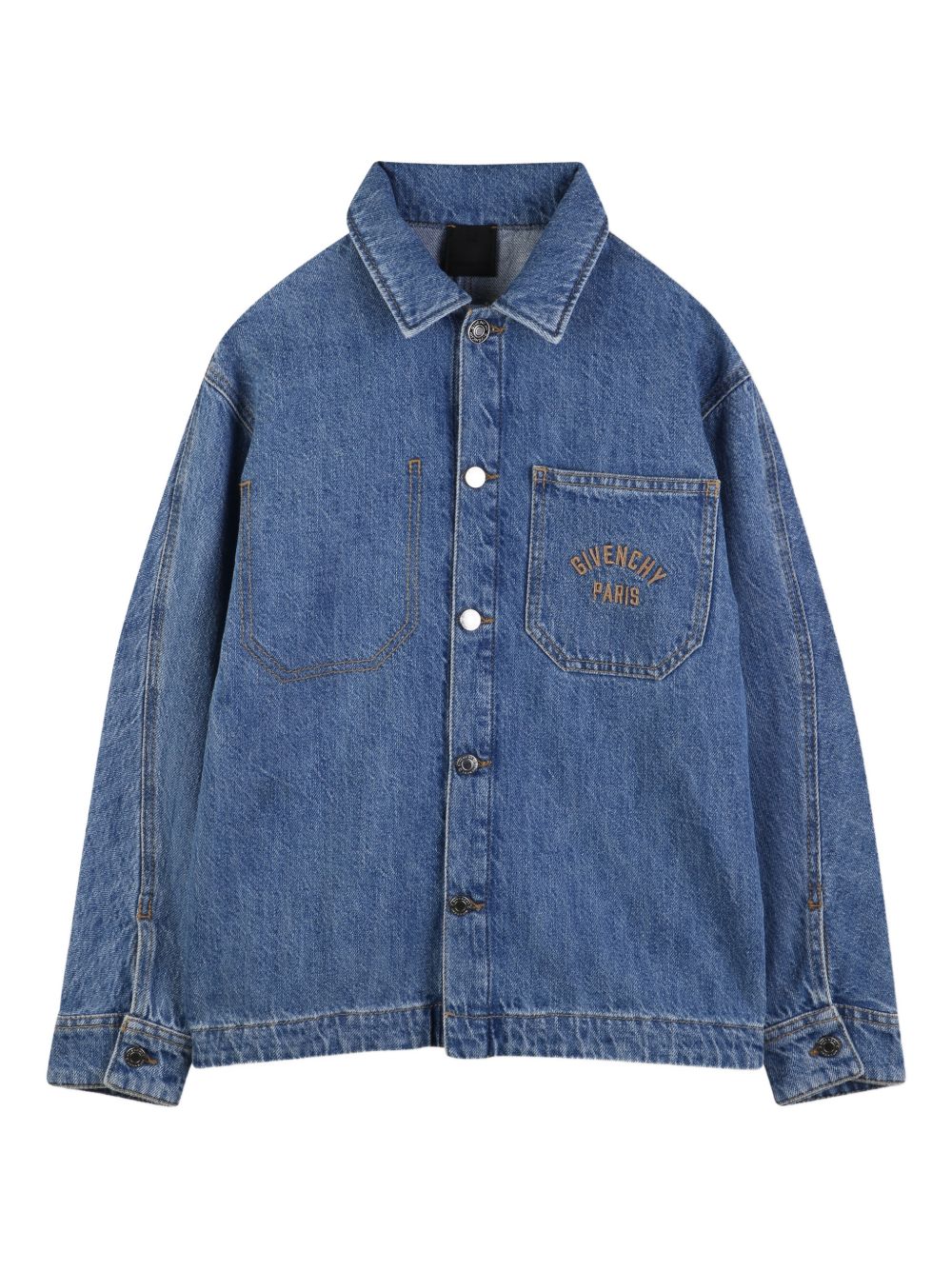 Camicia in denim con tasca sul petto blu, logo ricamato, chiusura con bottoni, colletto a maniche lunghe