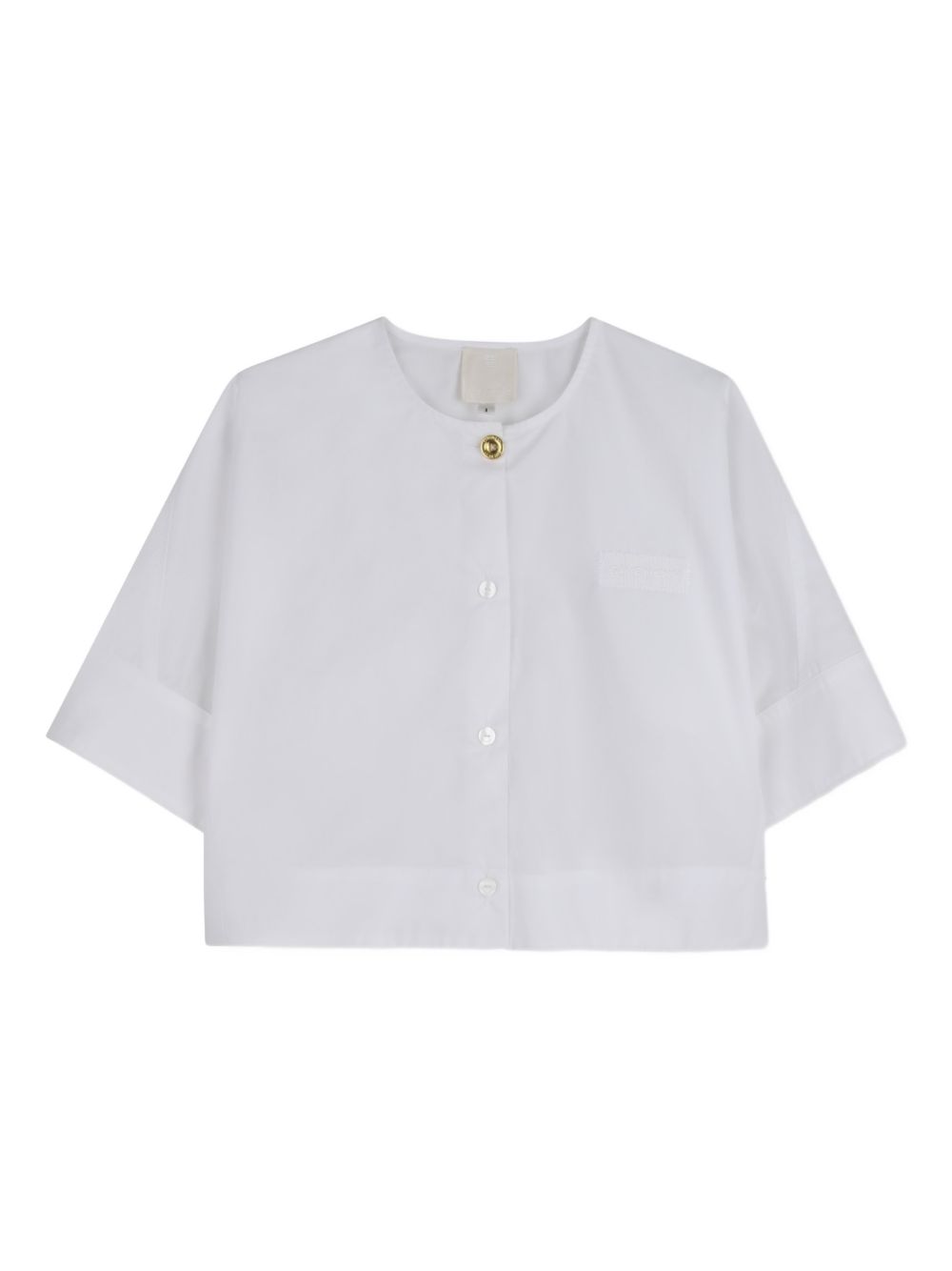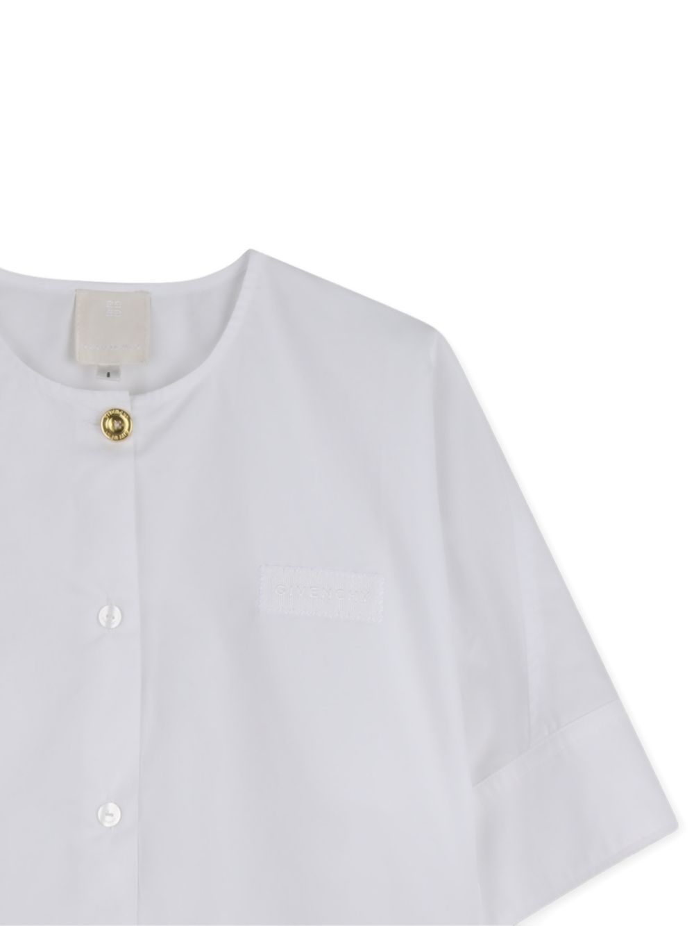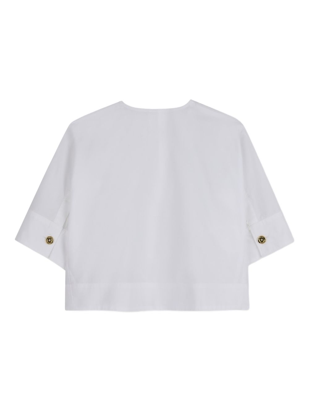 Camicia bianca con bottoni color oro, maniche corte chiusura con bottoni