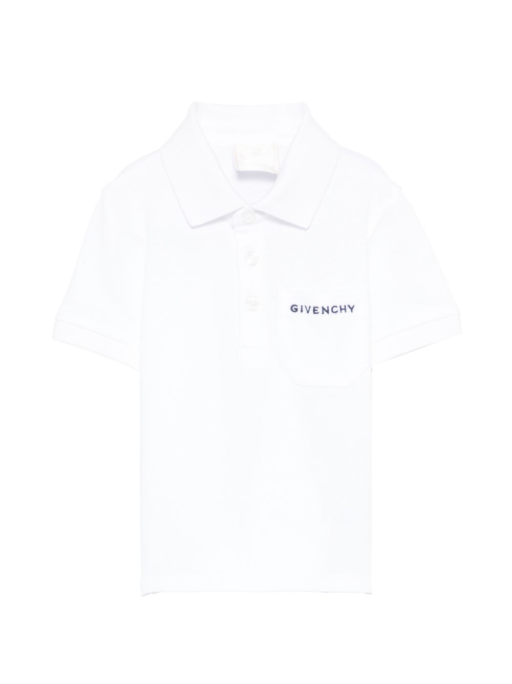 Polo bianca con tasca sul petto, chiusura con bottoni, maniche corte, colletto polo