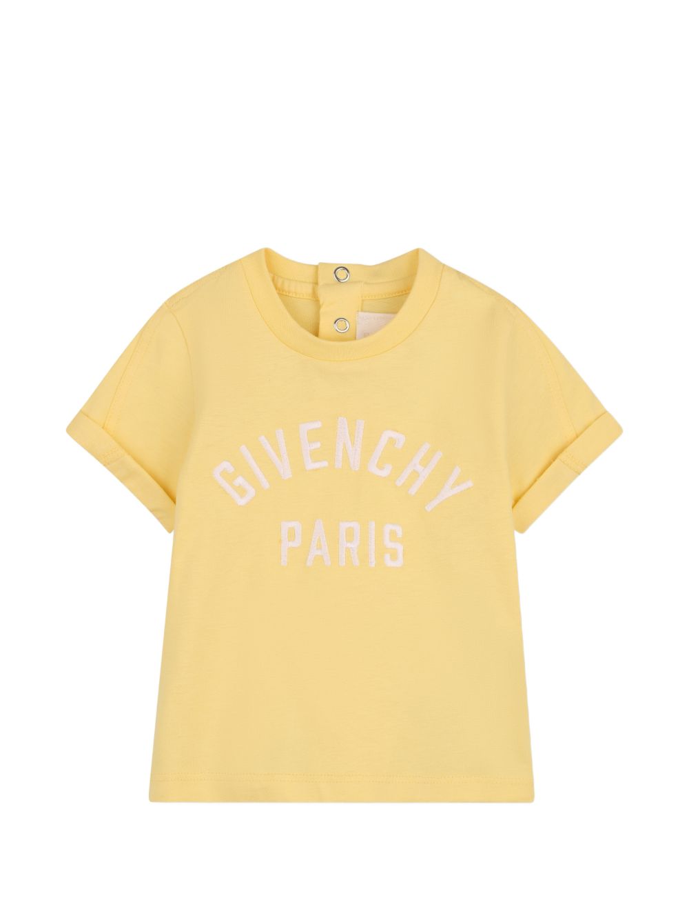 T-shirt con ricamo , gialla, chiusura con bottone a pressione, maniche corte, polsini arrotolati