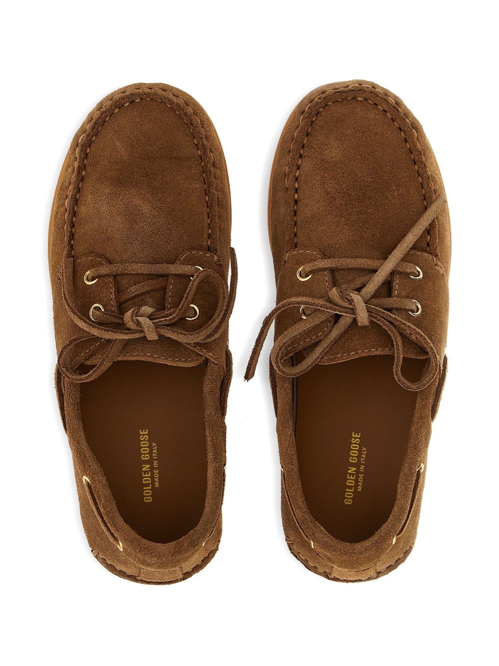 Tomaia in pelle scamosciata marrone, chiusura con lacci, stile scarpa da barca, suola in gomma, soletta in pelle.