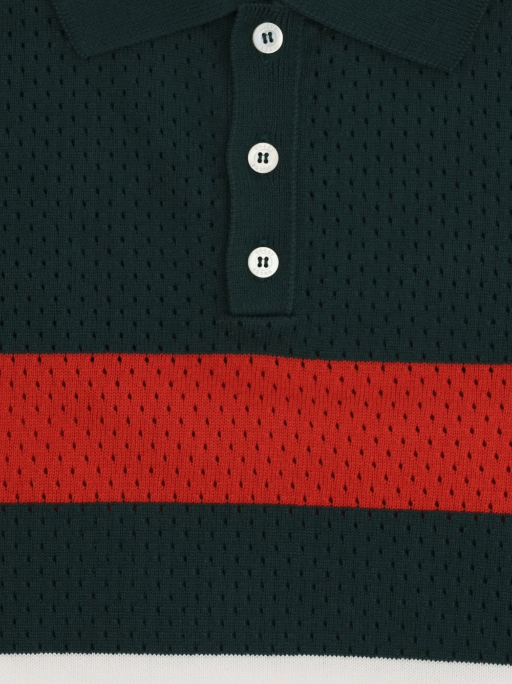 Polo a righe Web in cotone bianco, maniche corte, abbottonatura frontale, polsini e orlo a coste.