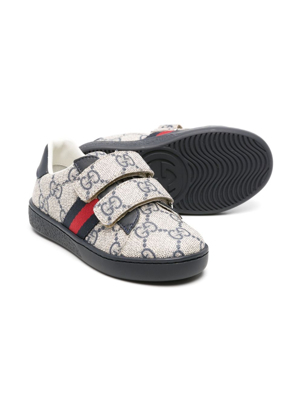 Tela GG Supreme beige/blu notte, finiture in pelle, finiture con striscia Web distintiva, tallone con marchio a contrasto, punta tonda, chiusura frontale con cinturino a strappo, soletta in pelle con marchio, suola in gomma a contrasto.