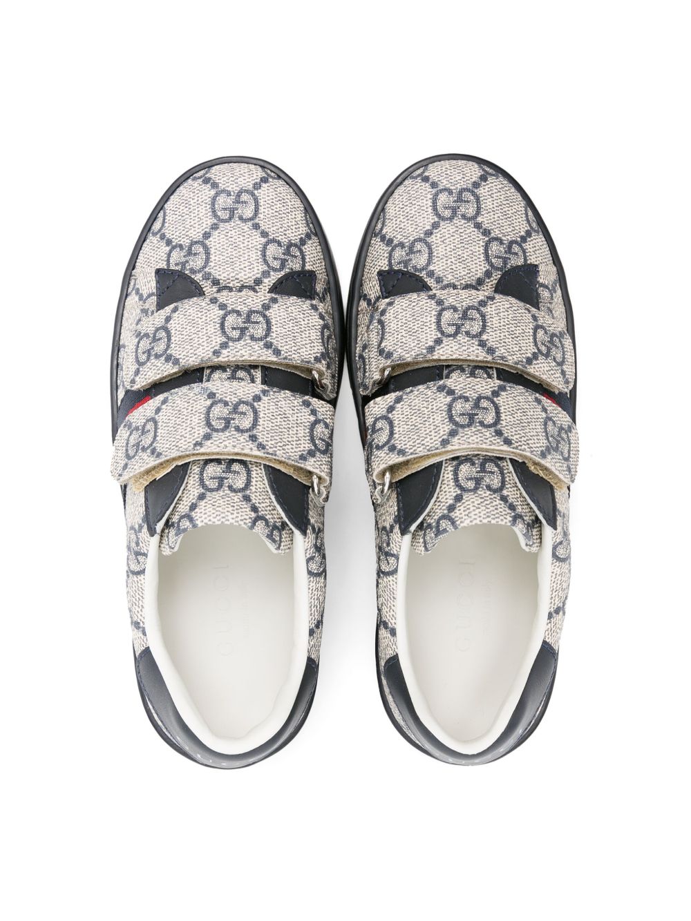 Tela GG Supreme blu notte/beige, finiture in pelle, finiture con striscia Web distintiva, tallone con marchio a contrasto, punta tonda, chiusura frontale con cinturino a strappo, soletta in pelle con marchio, suola piatta in gomma.