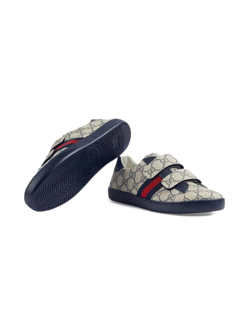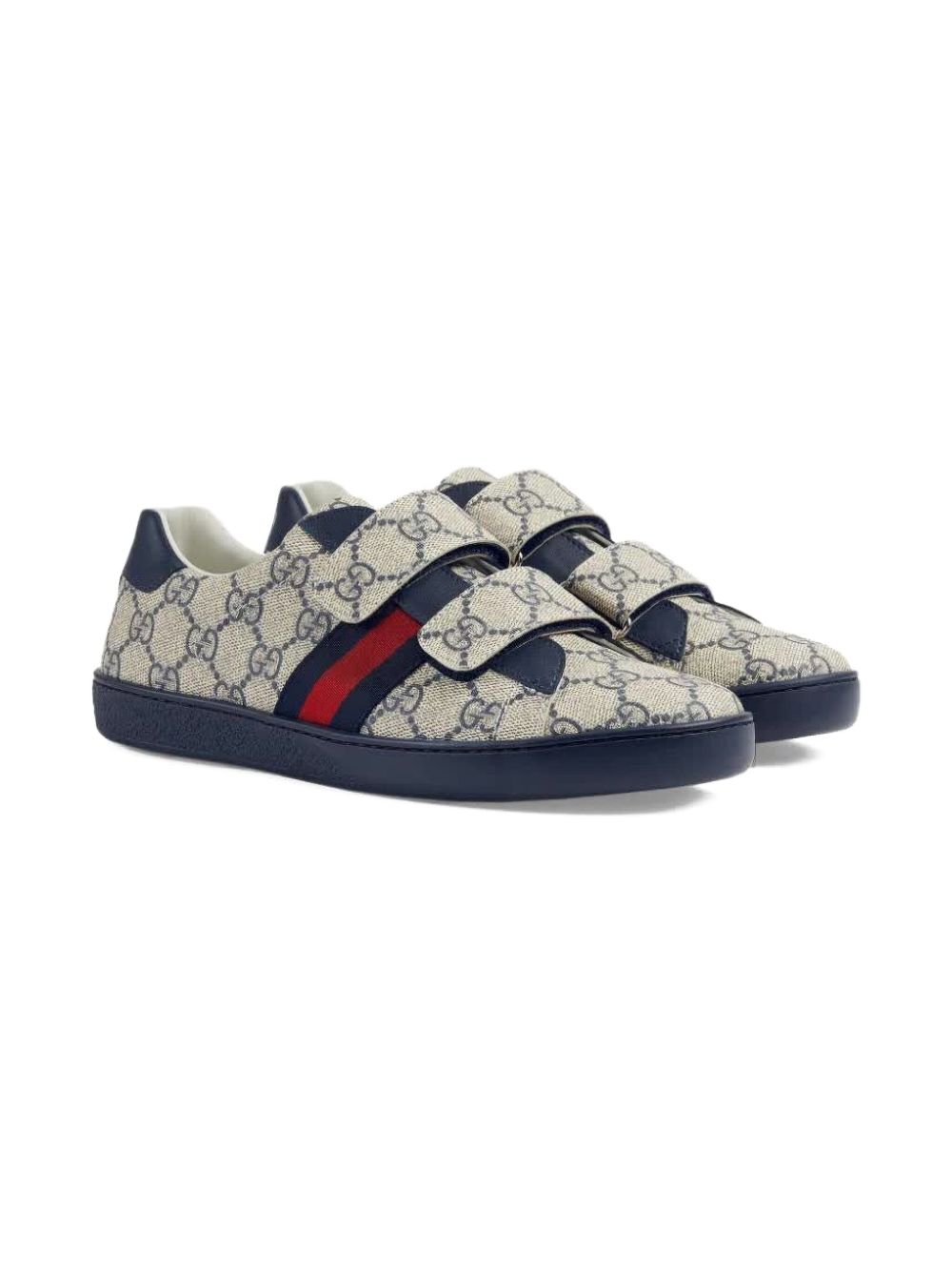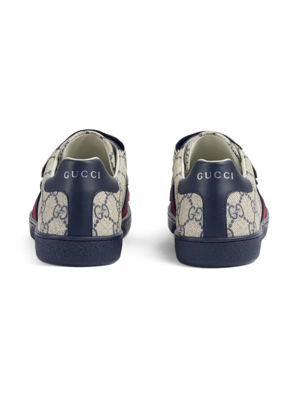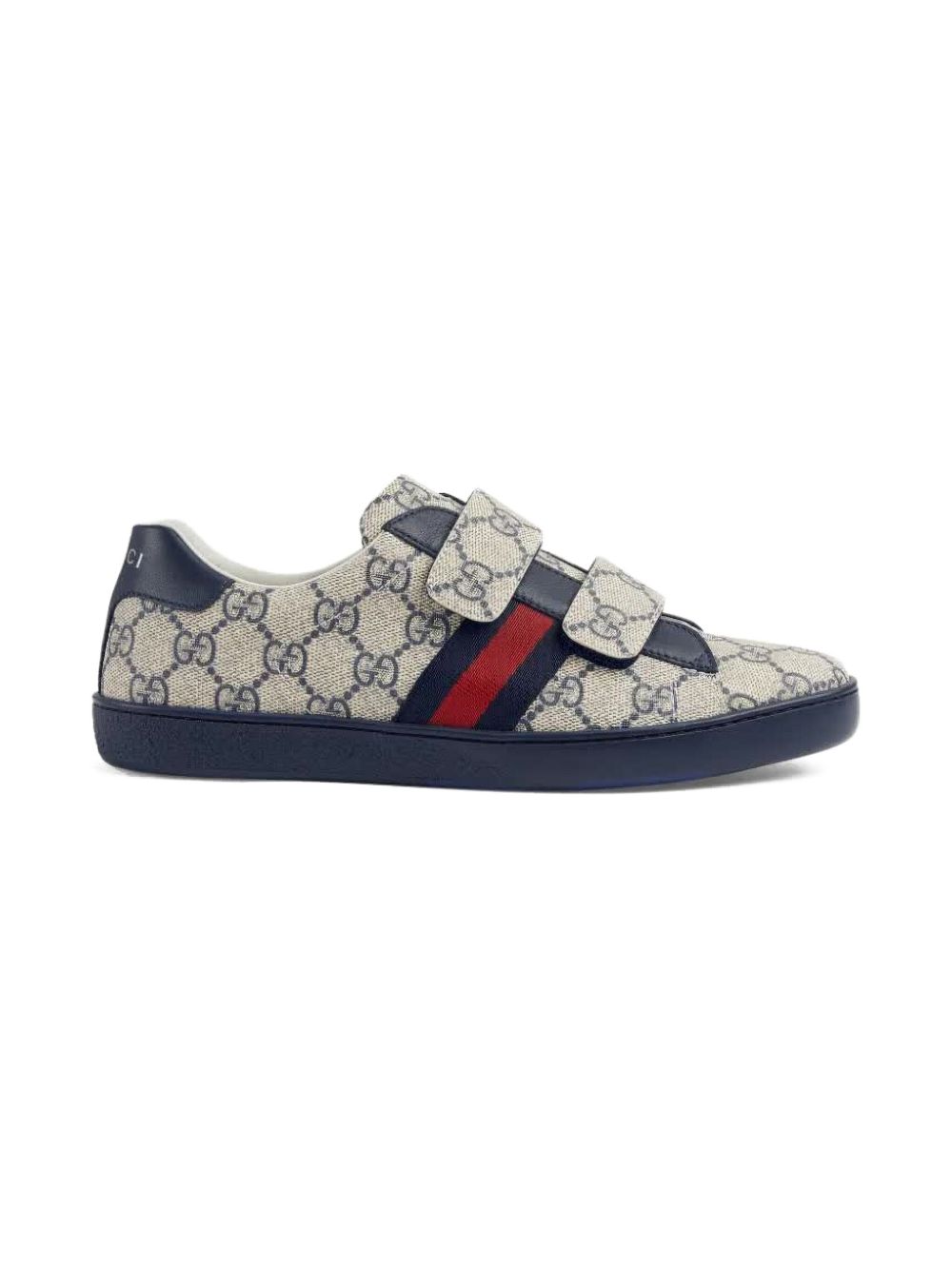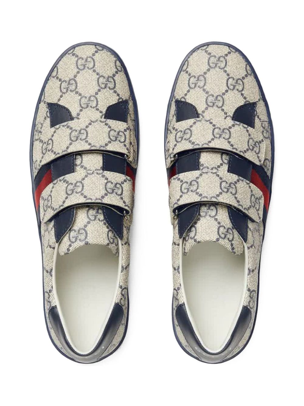 stampa GG Supreme blu navy/beige, dettaglio Web con logo, tallone con logo a contrasto, design a doppio cinturino, chiusura con cinturino a strappo, punta tonda, soletta in pelle con logo, suola piatta in gomma.