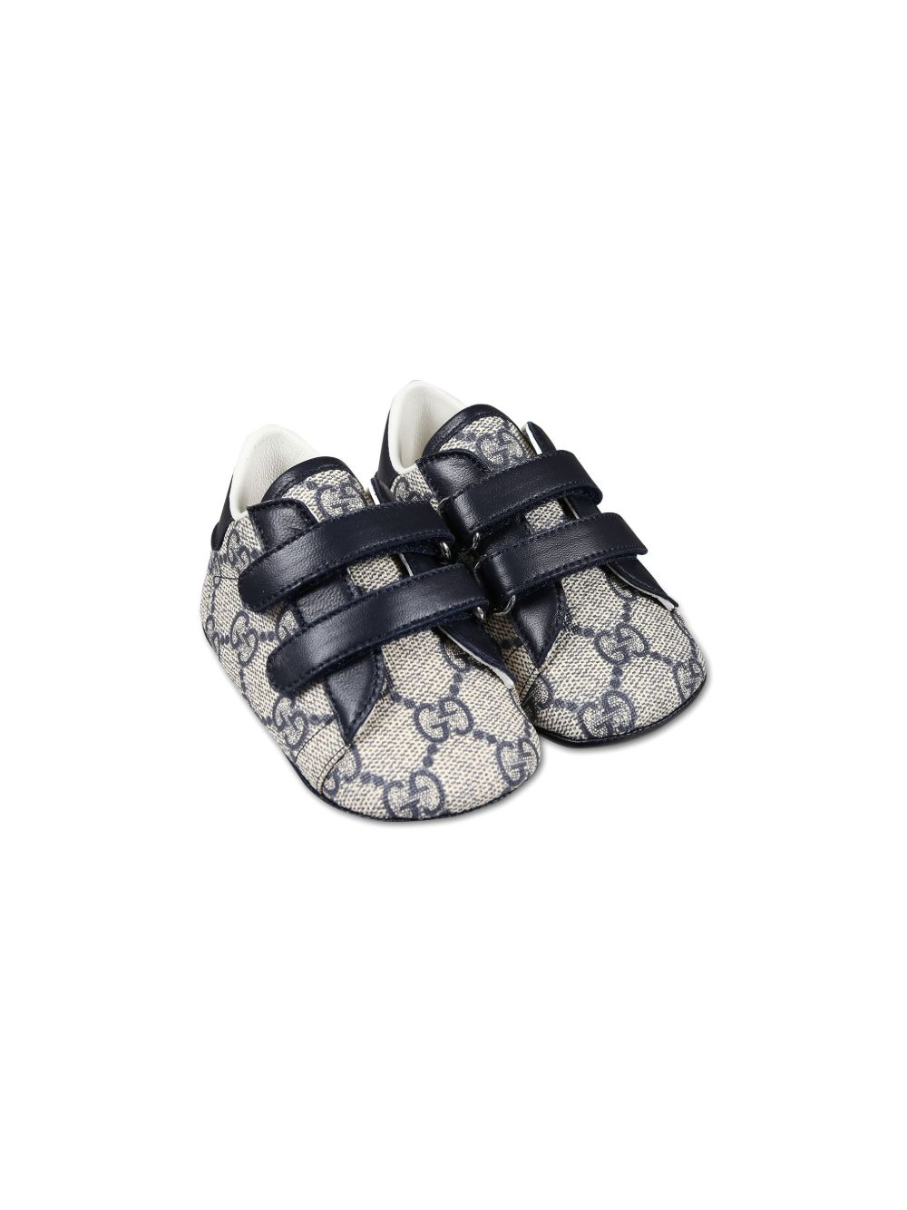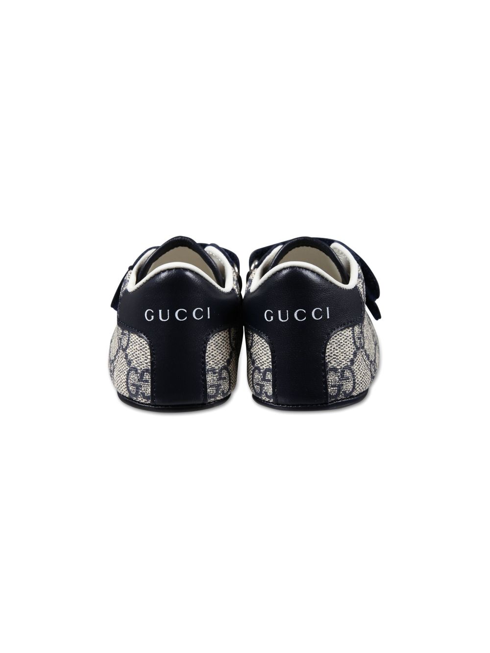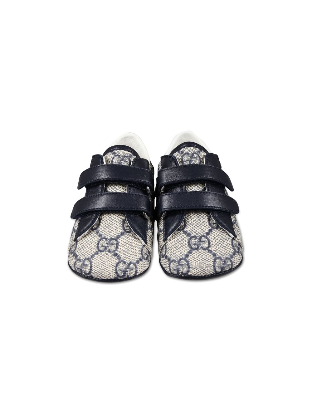 tela/pelle blu beige, jacquard GG Damier, punta tonda, chiusura frontale con cinturino a strappo, soletta con marchio, contrafforte con marchio, suola piatta in gomma.