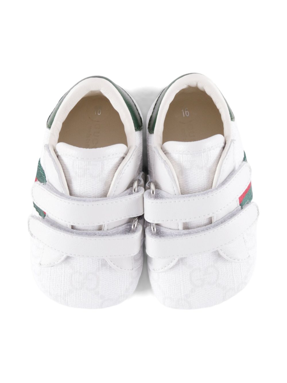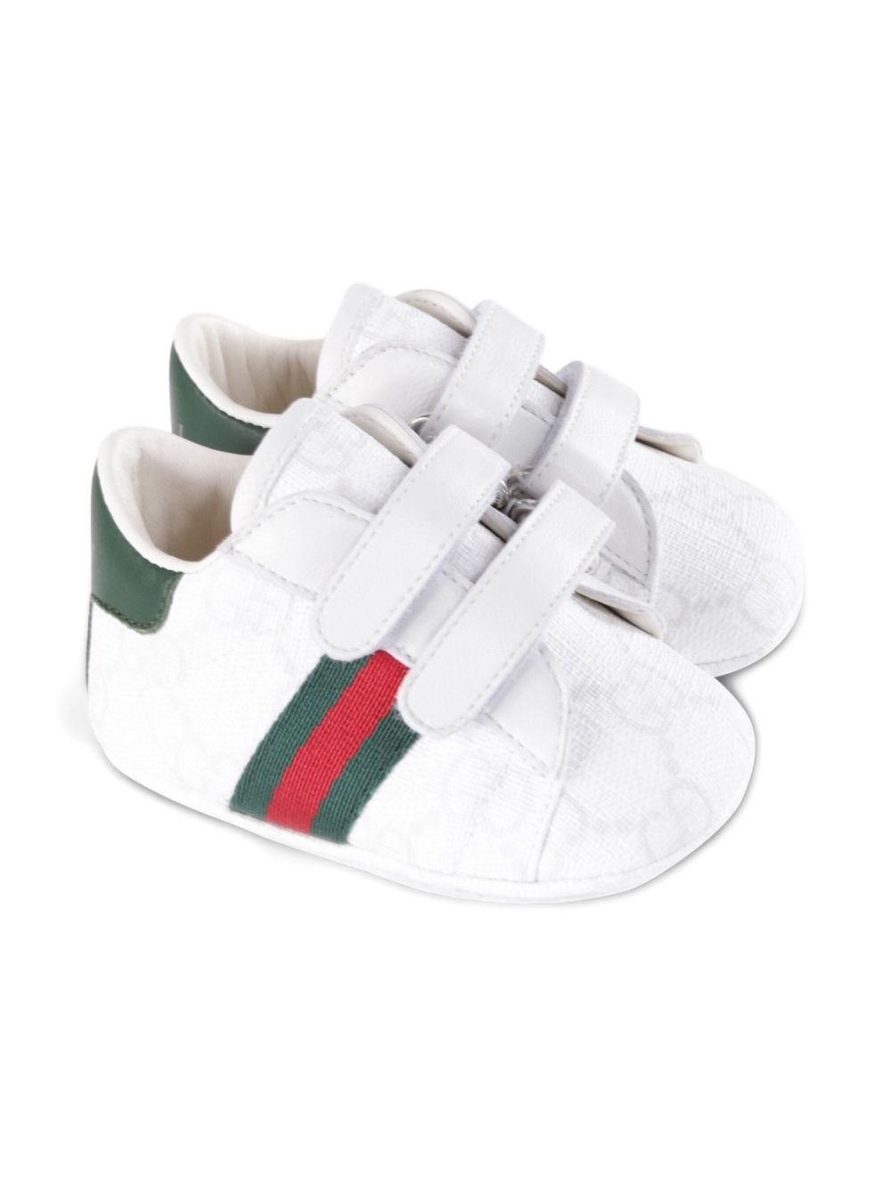 logo stampato in bianco, chiusura con strappo, dettaglio con striscia Web firmata, soletta imbottita