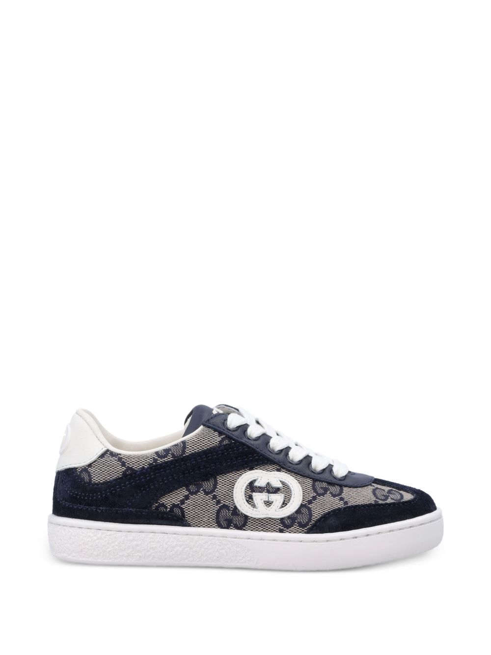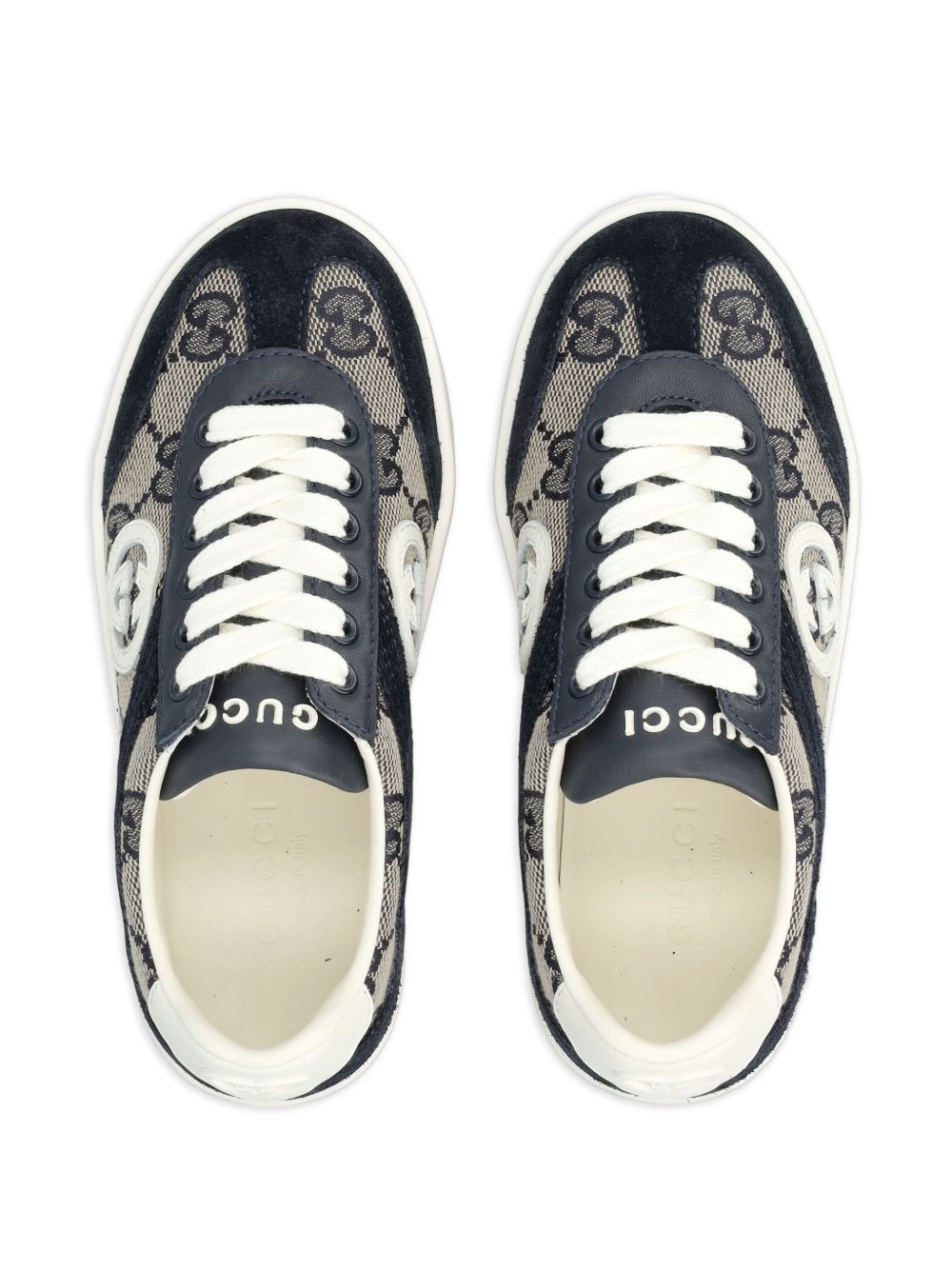 blu navy, chiusura con lacci, logo G intrecciato, punta tonda, suola piatta, finiture in pelle.