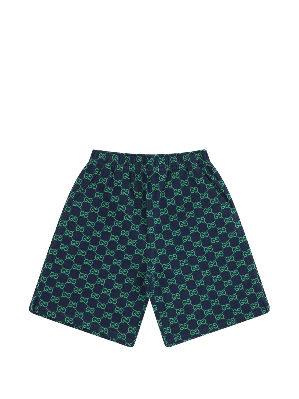 Tessuto piqué blu navy con monogramma GG, elastico in vita e due tasche laterali a fessura.