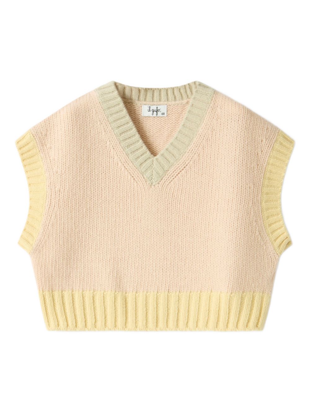 Gilet con scollo a V, rosa giallo e verde, orlo a coste.