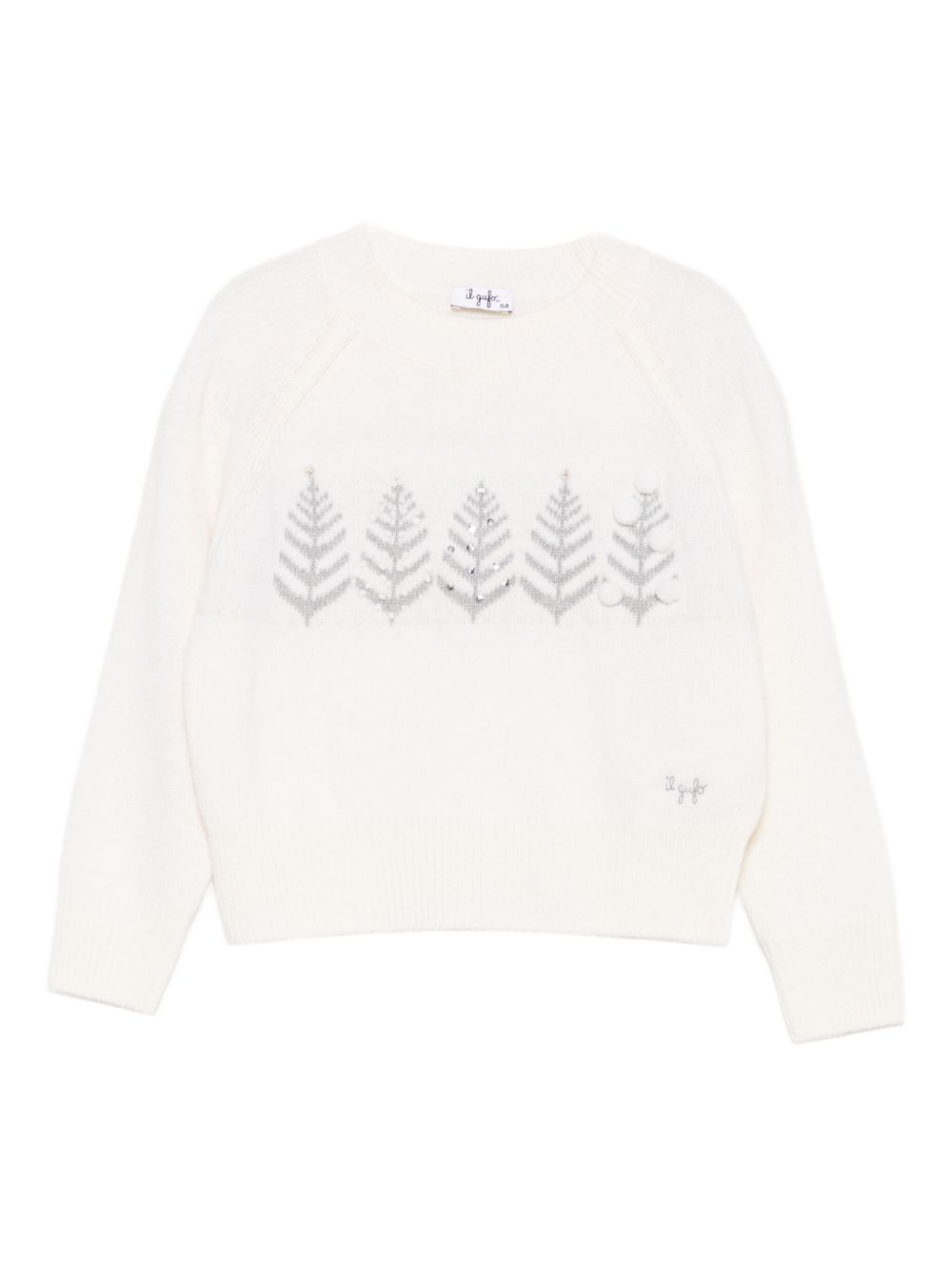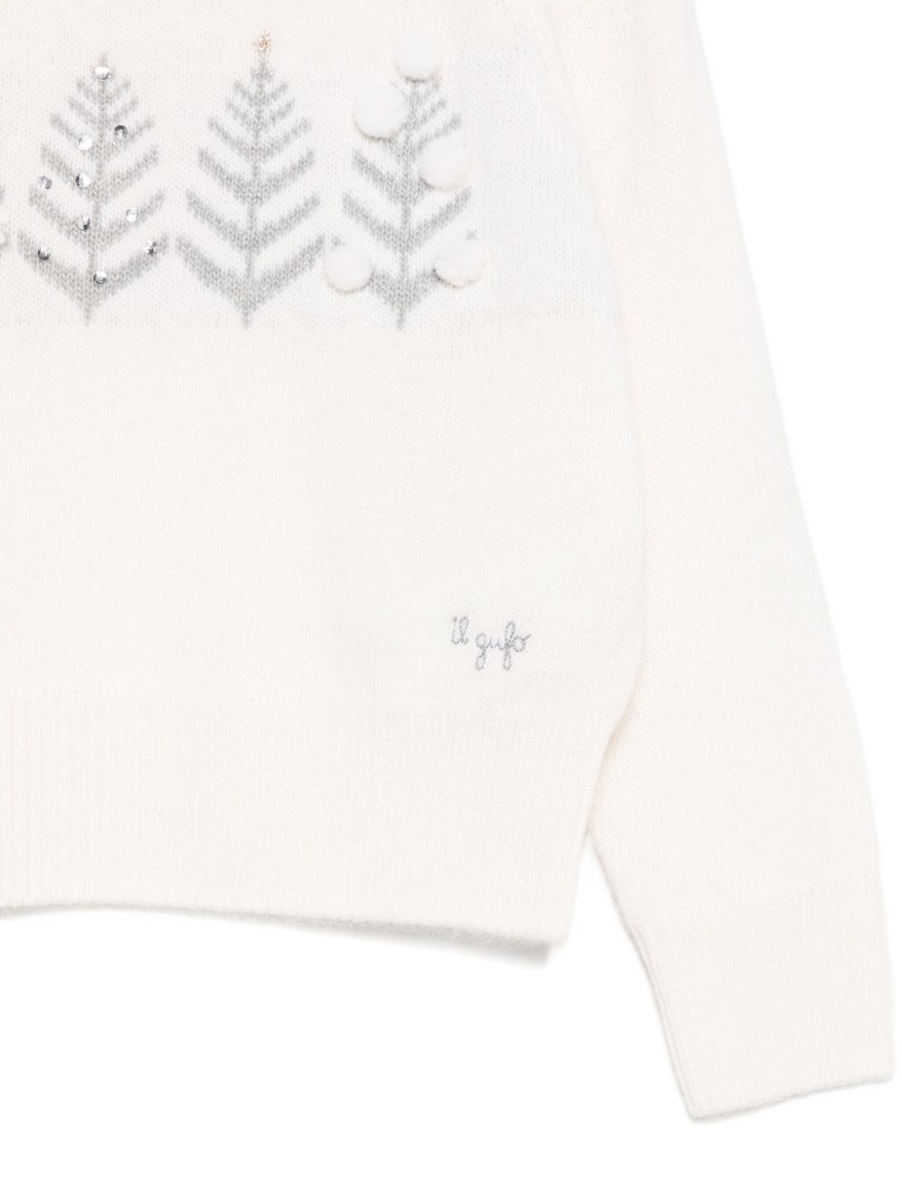 motivo albero bianco, dettagli in strass, dettagli pom pom, scollo tondo, maniche lunghe