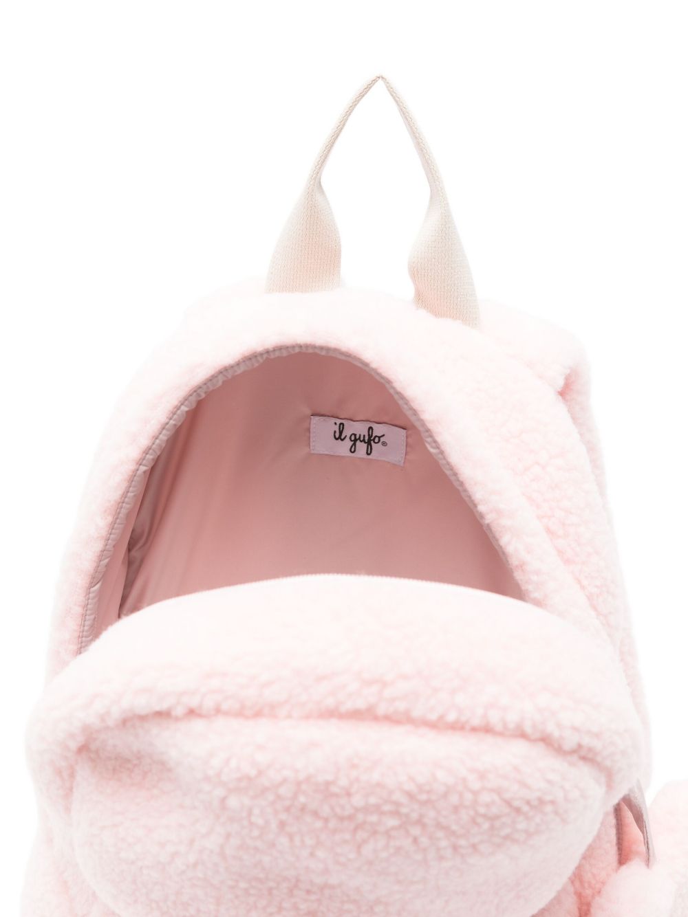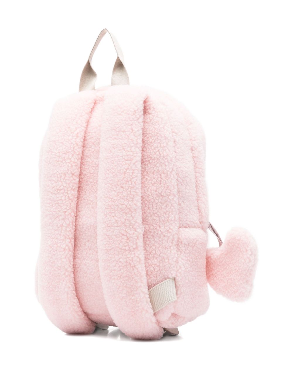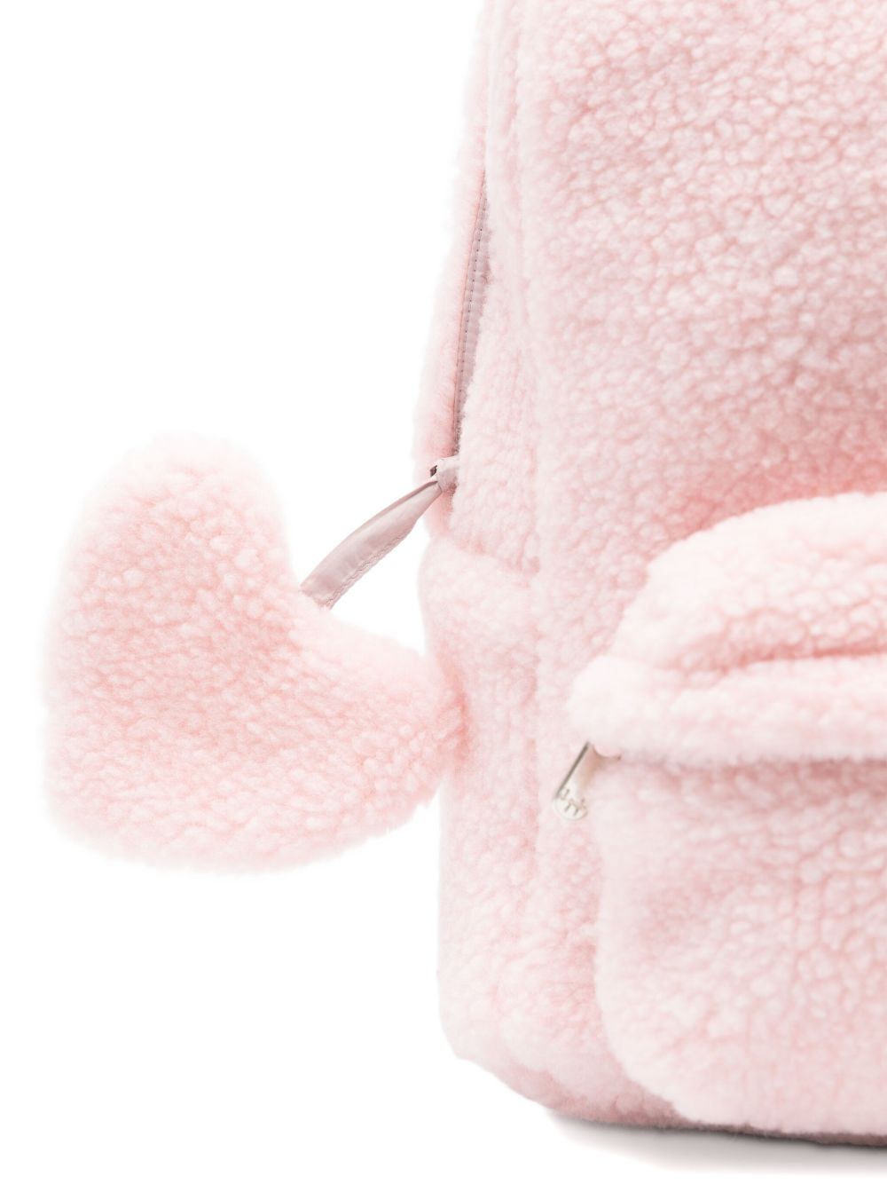 tessuto in pile rosa con decorazioni a forma di cuore, manico superiore, chiusura con zip, tasca frontale con zip