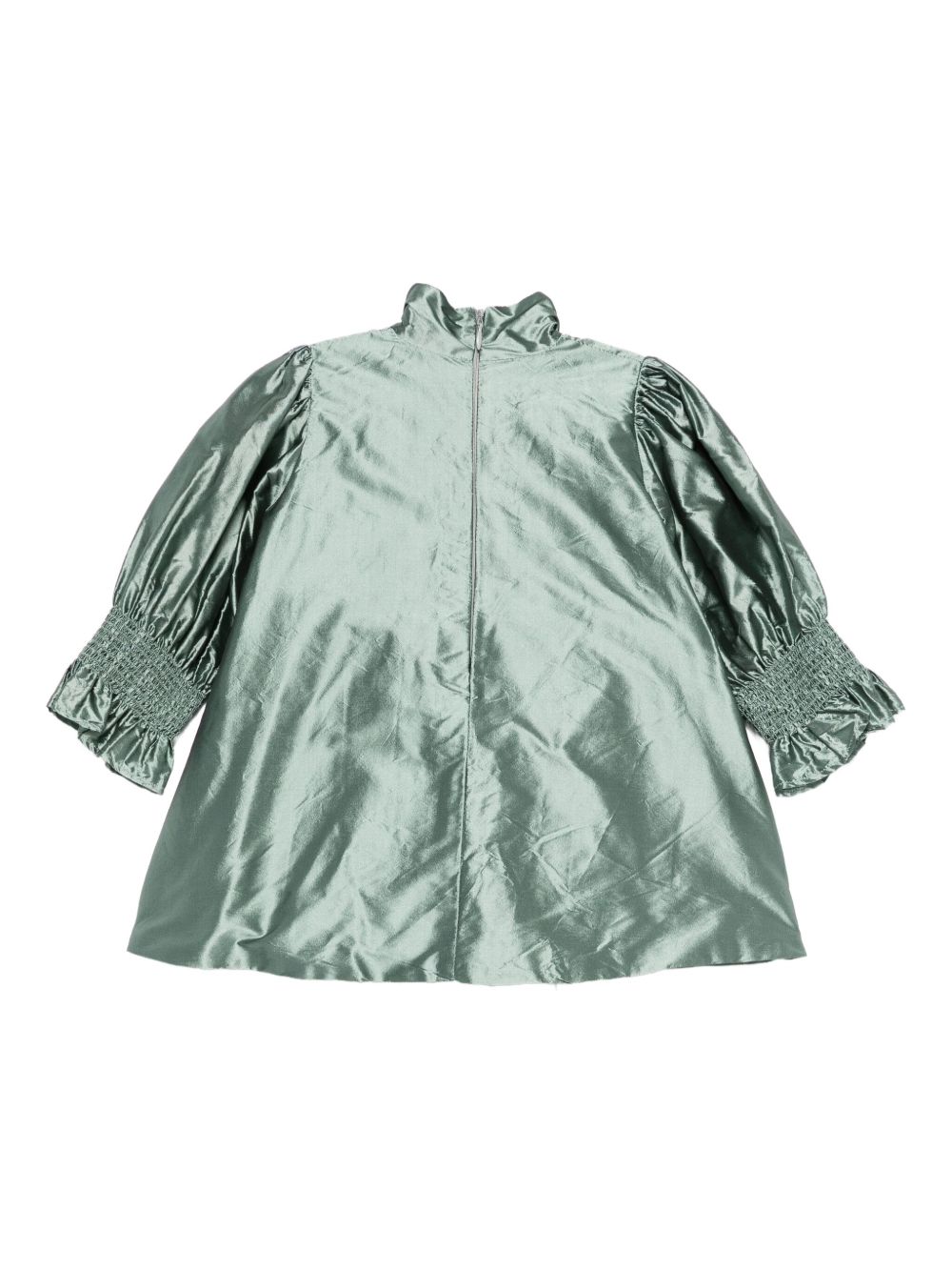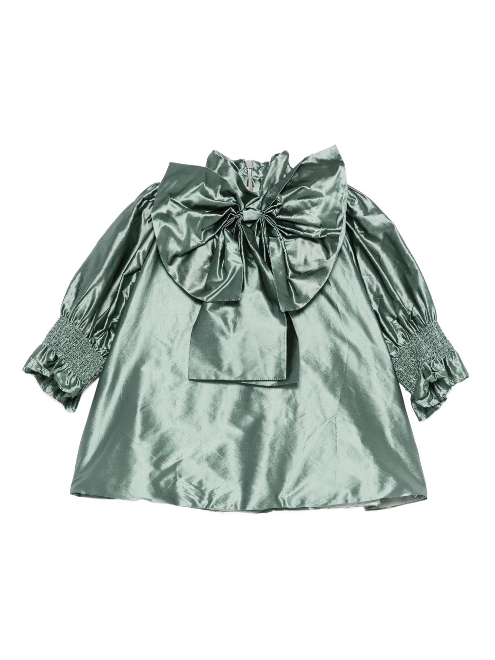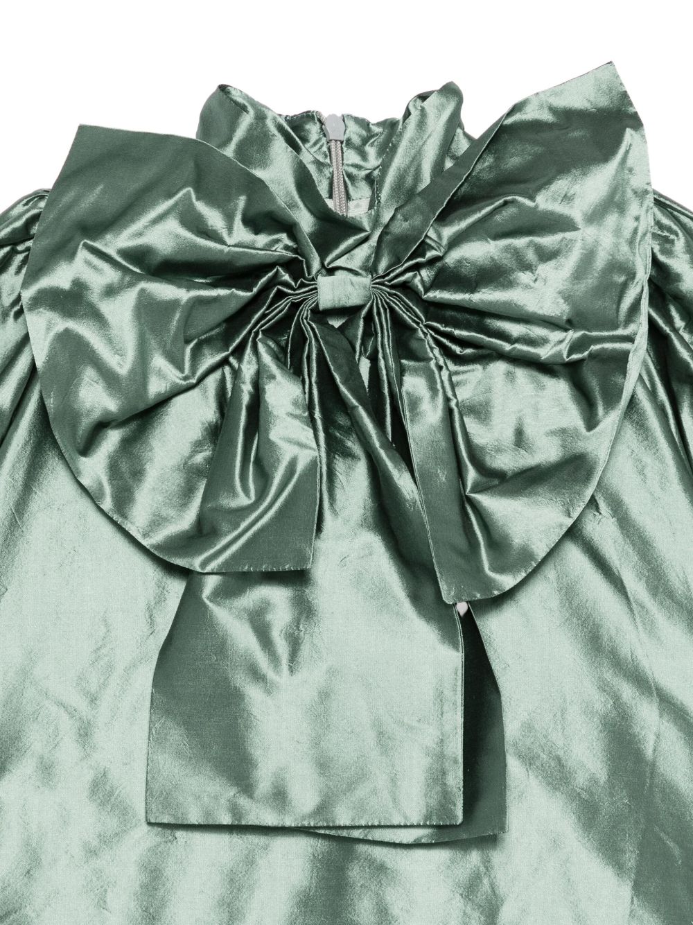 dettaglio fiocco verde polsini arricciati chiusura con zip maniche lunghe