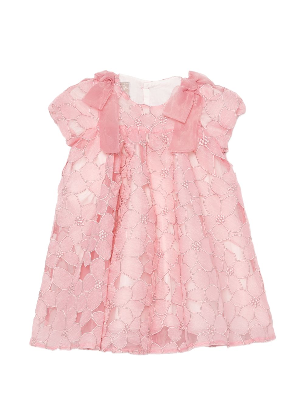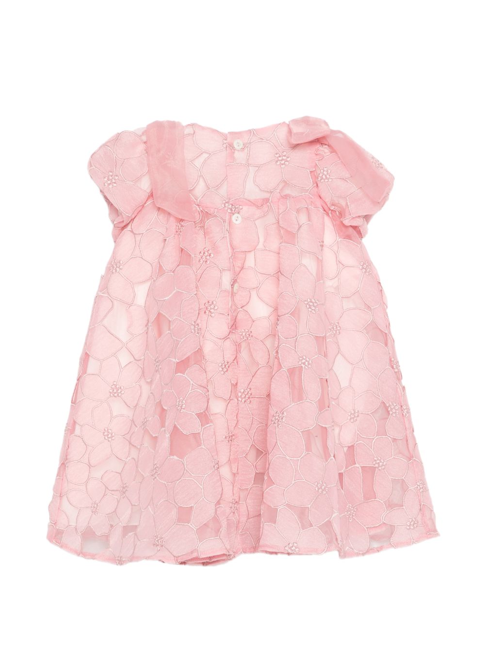 Abito a fiori con fiocco, rosa, maniche corte, design svasato, chiusura a bottoni