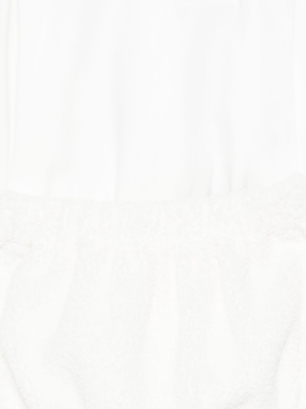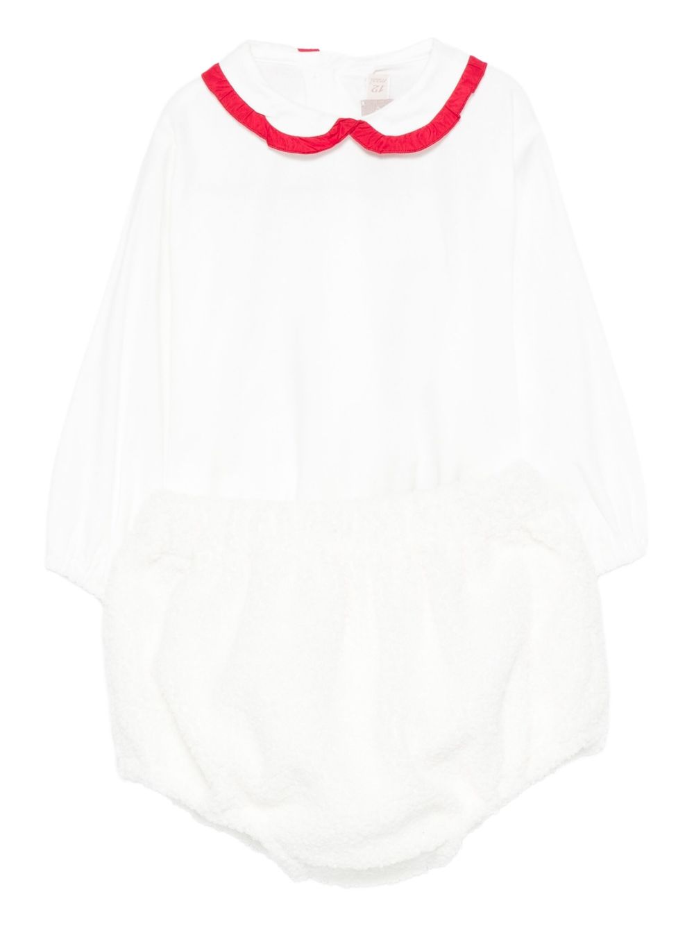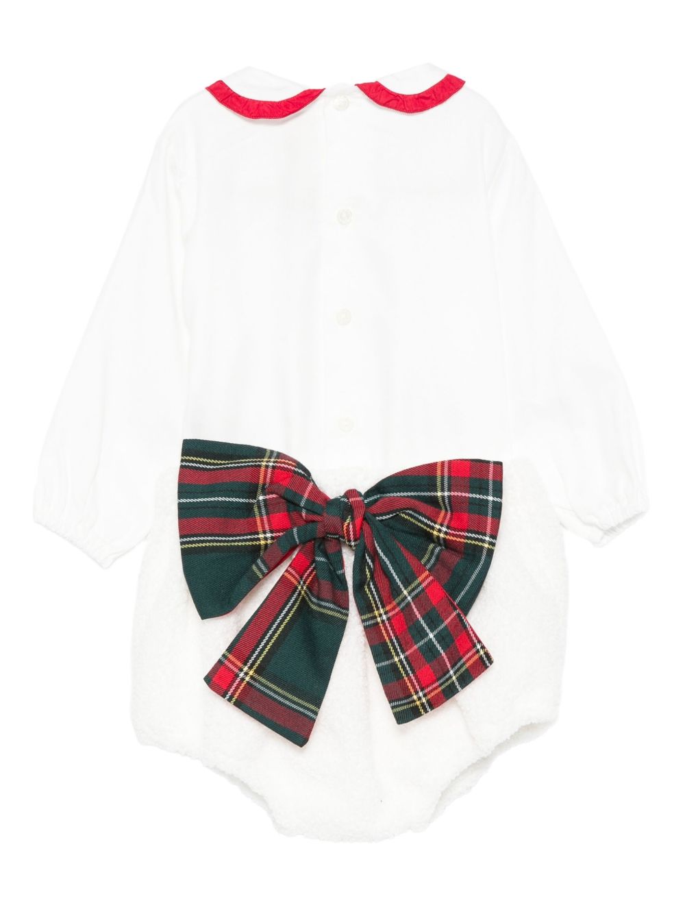 Baby Set bianco, collotto alla Peter Pan, dettaglio fiocco, maniche lunghe, chiusura a bottoni.