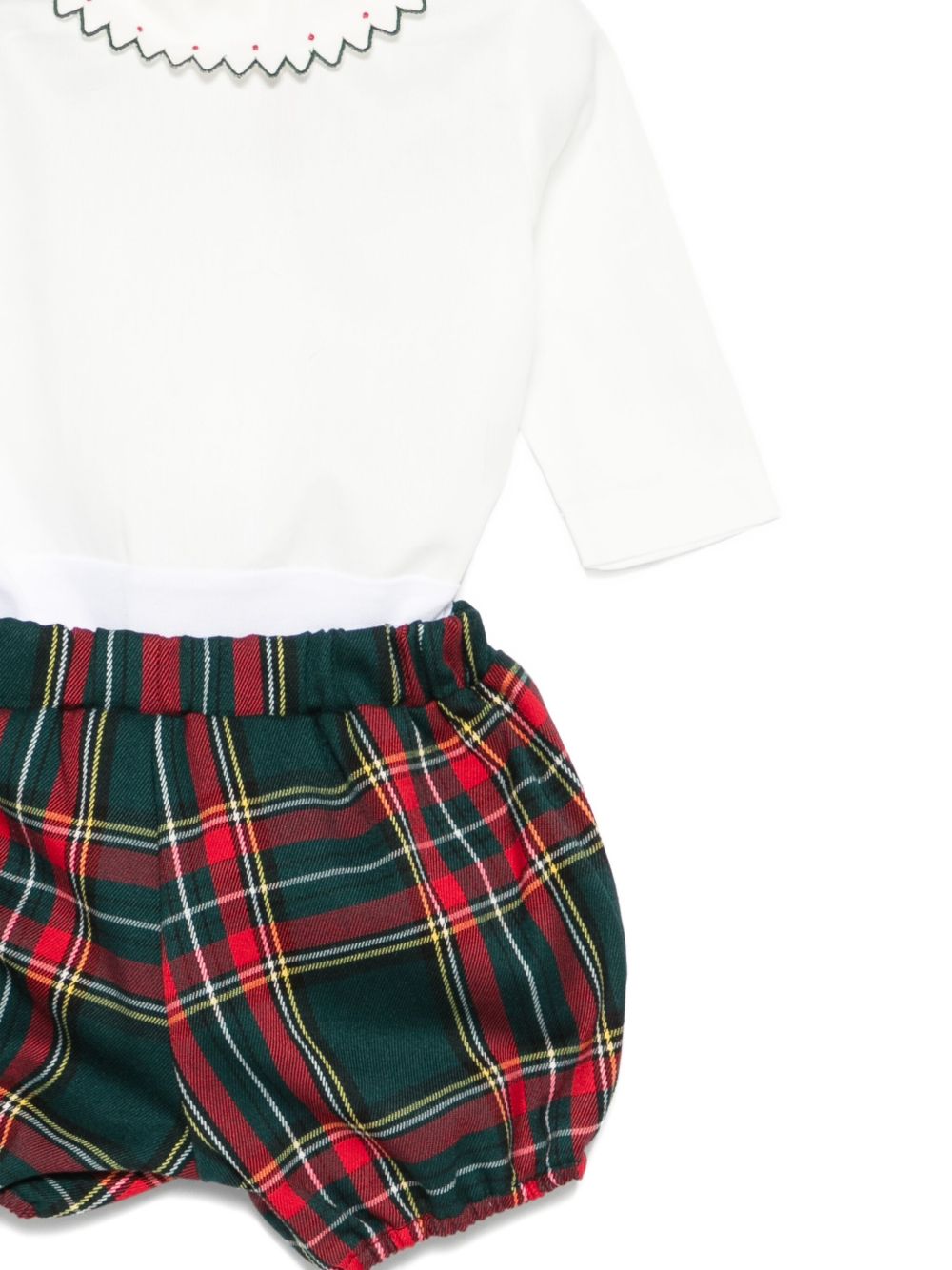 Baby Set verde, motivo tartan, vita elasticizzata, maniche lunghe, girocollo, dettaglio ricamato.