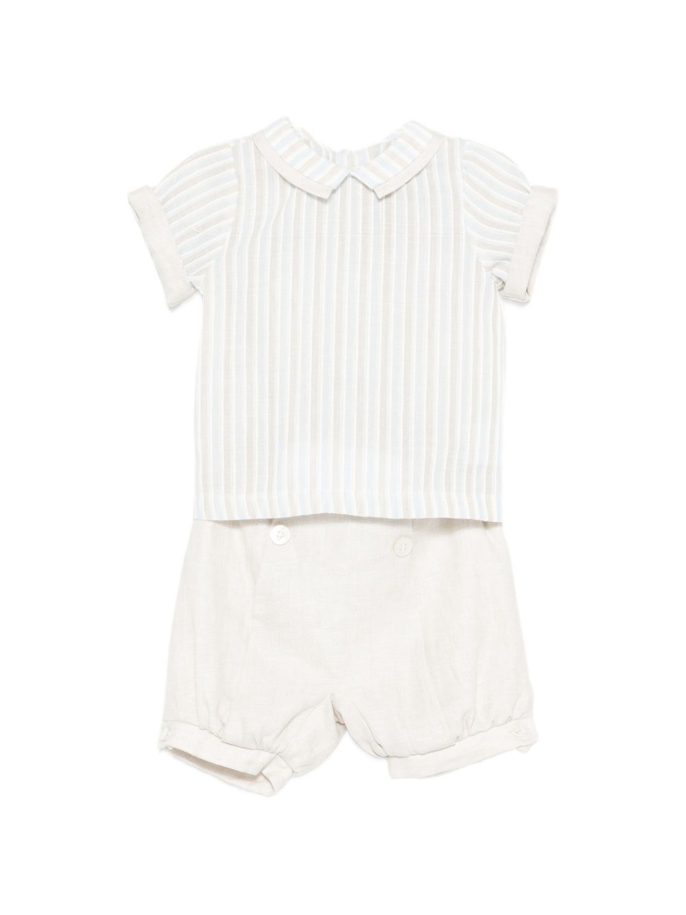 Set beige e celeste, motivo a righe, design con colletto, chiusura a bottoni, manihce con polsini
