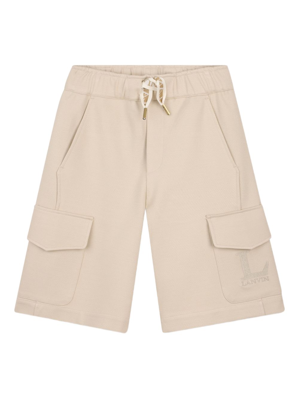 Bermuda con tasche cargo beige, chiusura con coulisse, elastico in vita, dettaglio logo, tasche diagonali