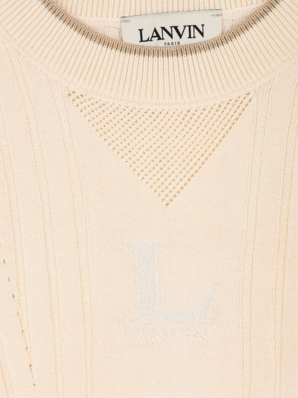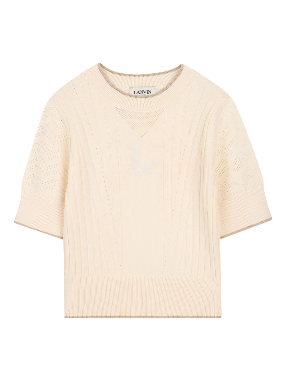 maglia a coste color crema con dettagli traforati, maniche corte, scollo rotondo
