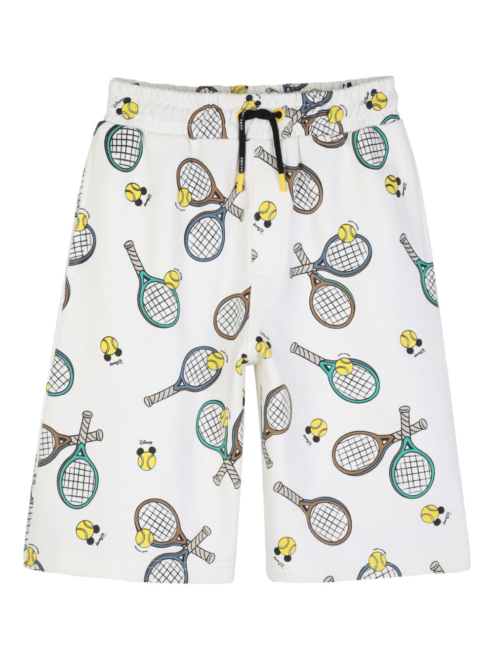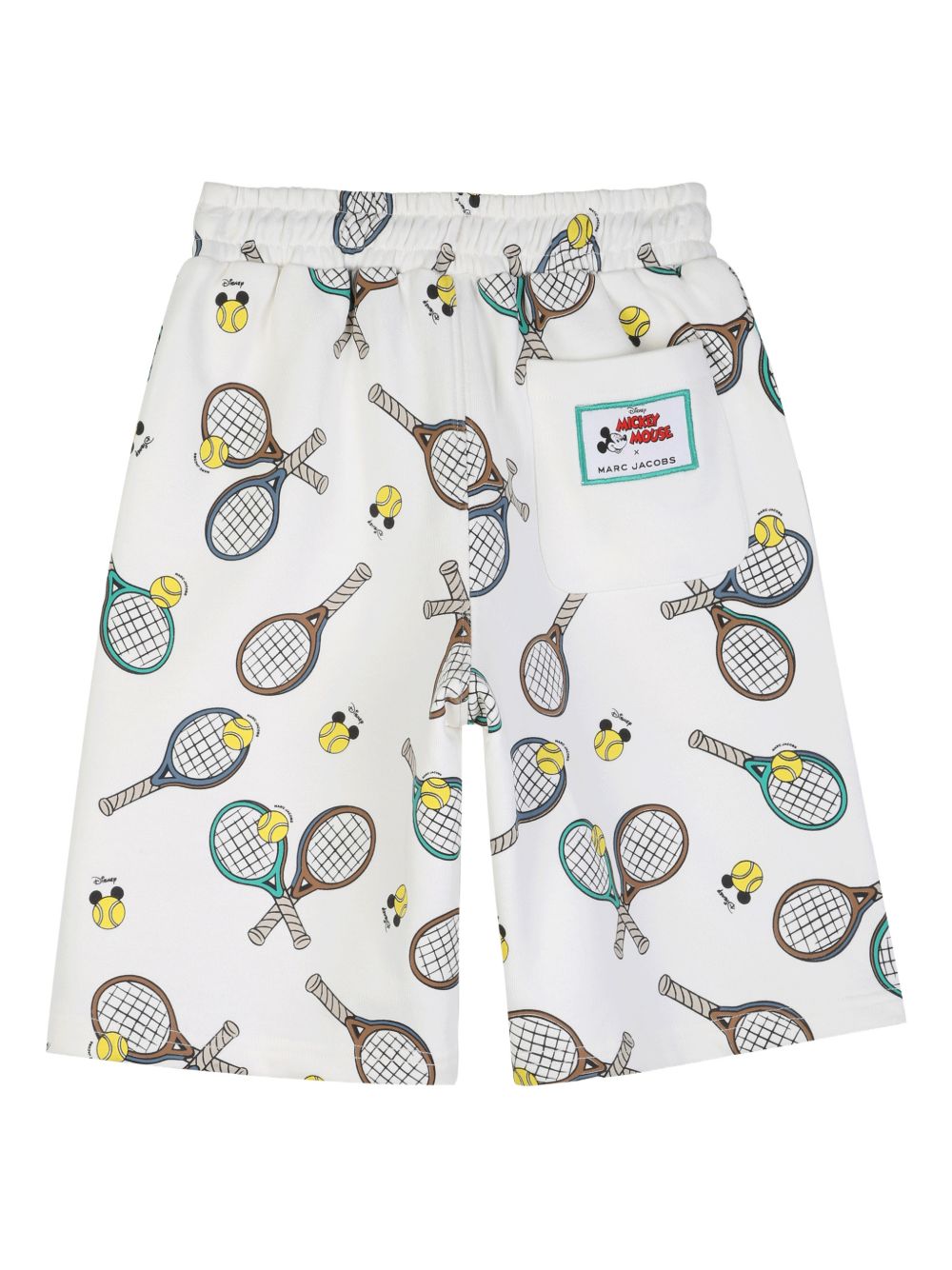Bermuda bianco con stampa tennis, tasca posteriore applicata, chiusura con coulisse, elastico in vita