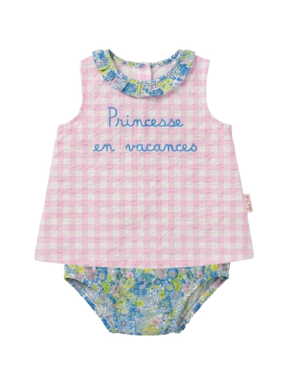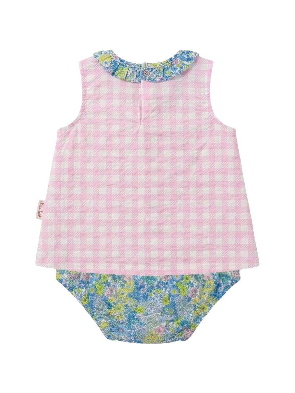 Baby set rosa, motivo a quadretti, stampa floreale, scollo rotondo con volant, senza maniche, taglio a trapezio, chiusura con bottoni a pressione sul retro, coulotte abbinate con stampa floreale