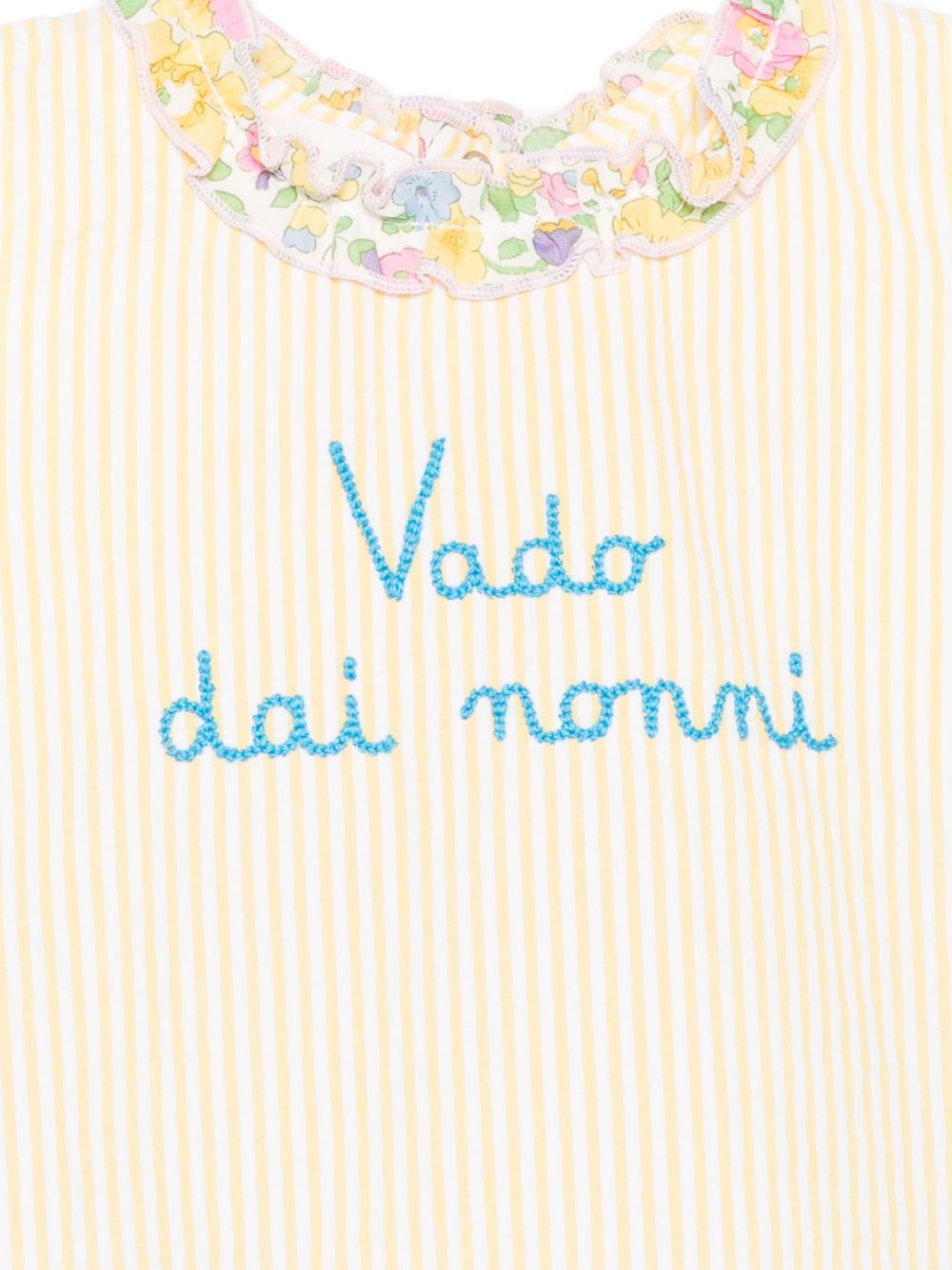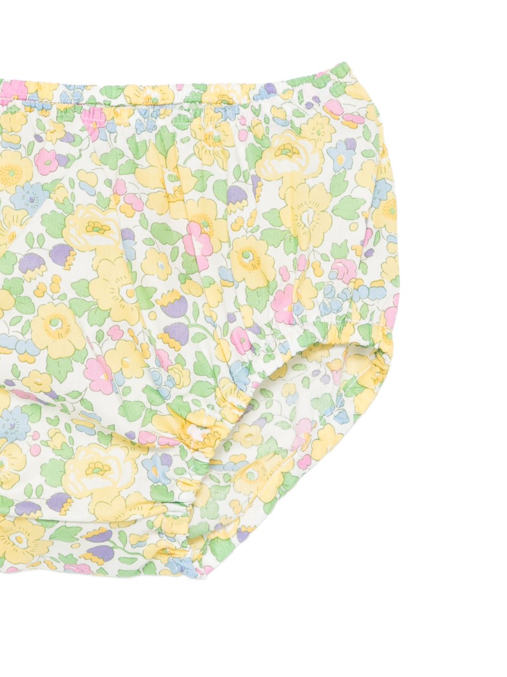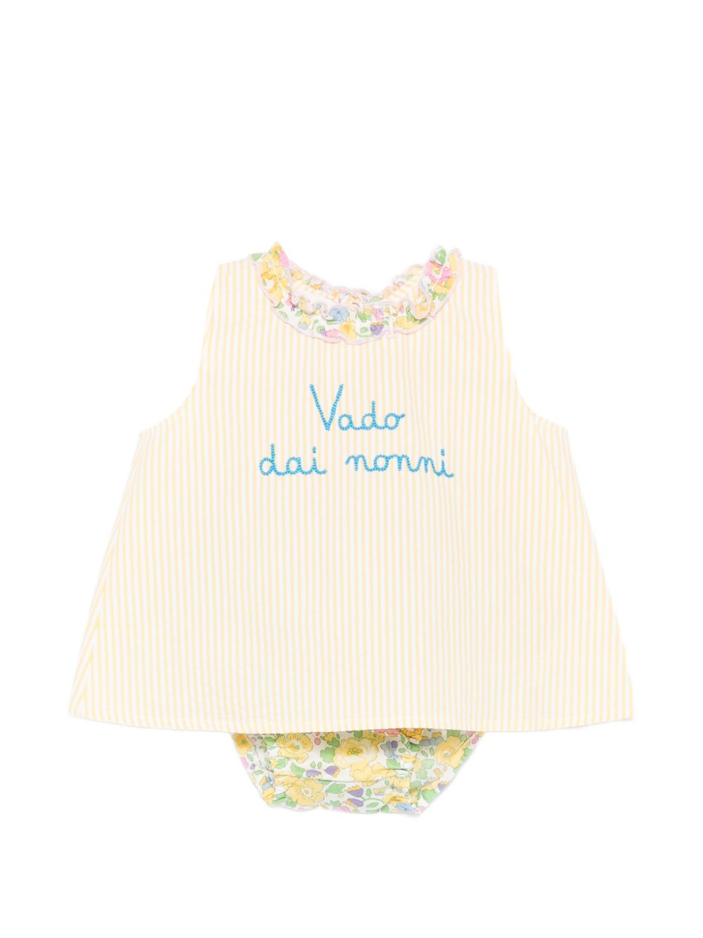 Baby set con stampa fiori, giallo, senza maniche taglio a trapezio, colletto con balza, chiusura con bottoni a pressione sul retro, coulotte con stampa a fiori abbinate.